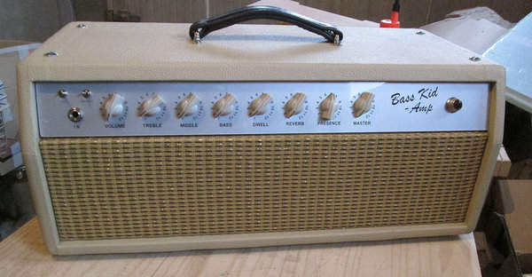 J'adore les Bassman, mais je trouvais dommage qu'ils n'aient pas de reverb. mais ne voulant pas une tête trop haute à cause du tank, je me suis décidé pour une reverb digital Belton. En fait, juste pour mettre un peu d 'ampleur, ça suffit largement. Le circuit est classique, tone stack avec treble-middle-bass et une présence dans le PI, suivi d'un master. Le signal pour la reverb est pris sur le potar de volume, puis le signal réverbéré est mélangé au signal dry dans la dernière triode juste avant le PI.