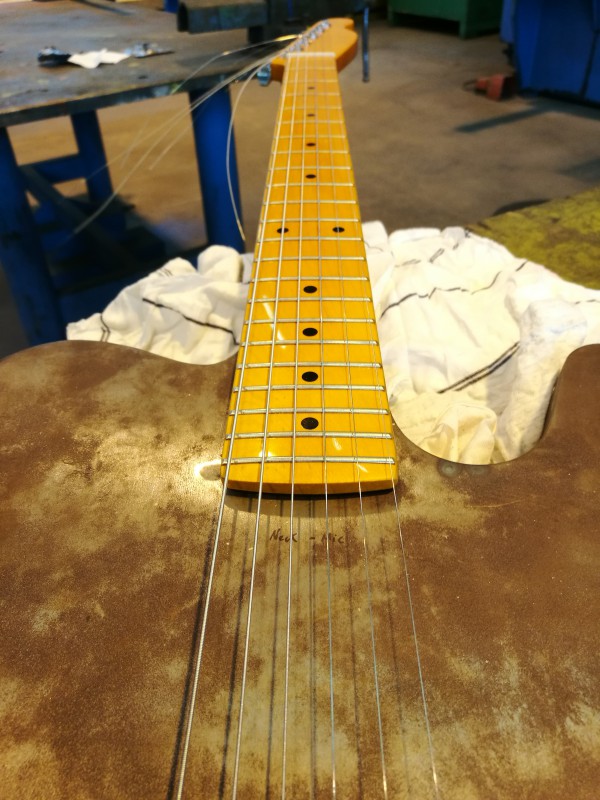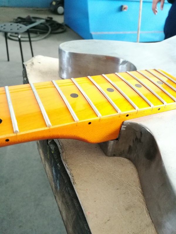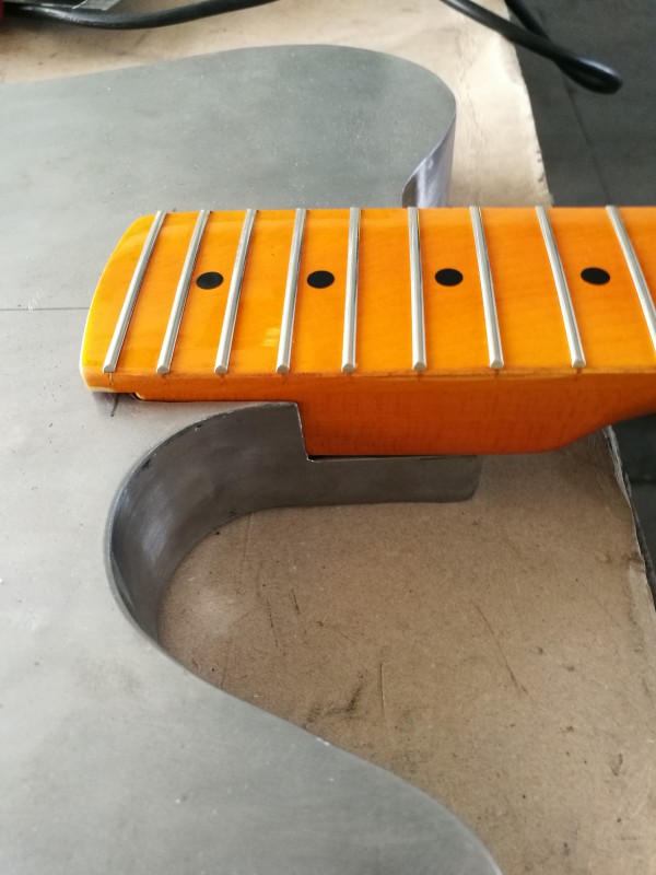 Aujourd'hui j'ai fait la découpe du manche, étape assez délicate pour bien ligner le manche, et pour ne pas que le manche ait du jeu et soit bien emprisonné, il faut prendre son temps.