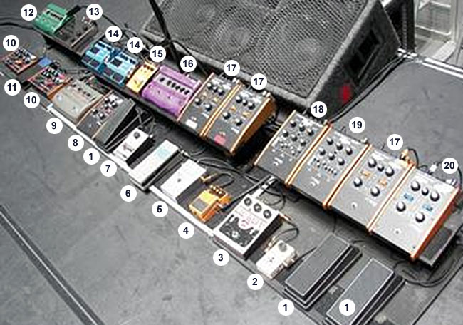 Dans les cas de ce genre, t'as p****n d'intérêt déjà à utiliser un gros looper pour gérer ton bordel, mais aussi à en caser une partie en rack sur des tablettes rétractables (surtout les énormes MoogerFoogers) et là aussi, on est content d'être DIYer ou si on est une rock-star, d'avoir un guitar tech qui s'y connaisse :