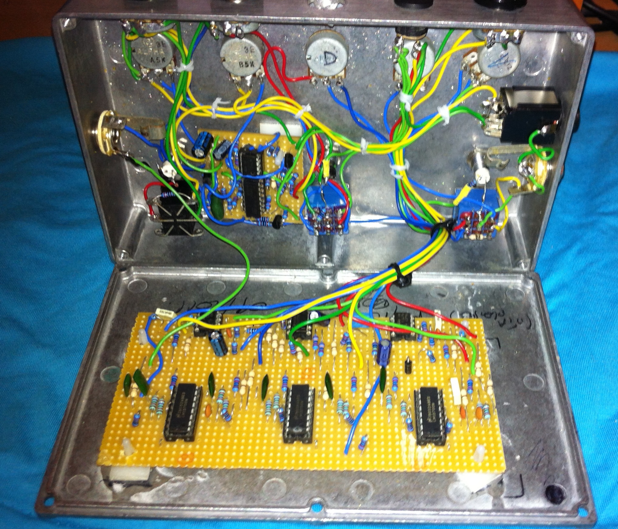 Je crois que tu t'emmerderais moins avec du circuit imprimé où au passage tu fixes carrément tes potars dessus ou au moins prévoir des connecteurs sur le CI...