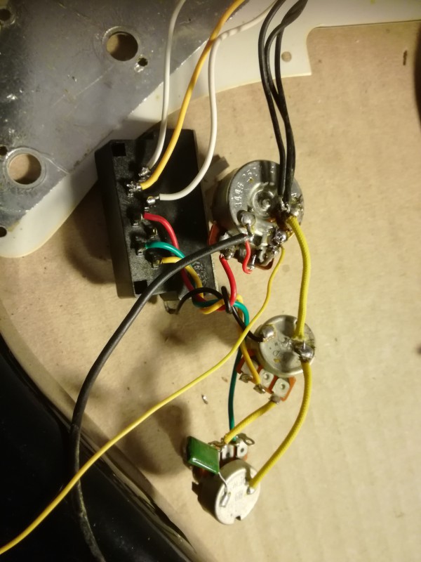 Ce que j'ai fait : refait ( tant bien que mal car je ne suis pas doué pour ça ) quelques soudures sèches ) reconnecté la masse chevalet au potard de volume ( alors qu'elle était connectée au tone du milieu ) et nettoyé les potards probablement bien oxydés avec un produit adéquat .
