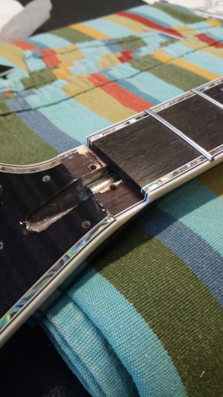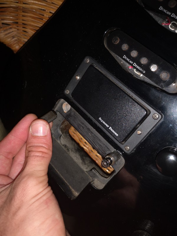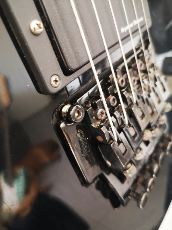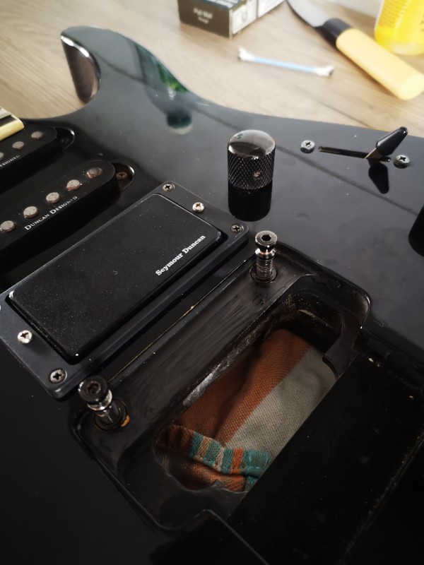J'ai plus qu'à changé le seymour duncan blackout ahb-2 qu'avait installé l'ancien proprio parce que c'est vraiment pas mon truc, et il manque aussi les bloc cordes du sillet de tête qui rend l'utilisation du floyd impossible.