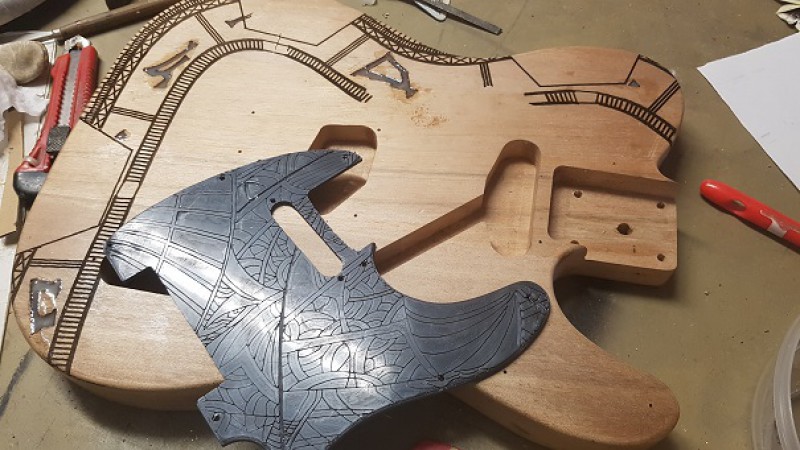 J'ai quand même pu peindre le pickguard, en gardant les couleurs des casques de Horus et d'Anubis, pour rester dans le theme.