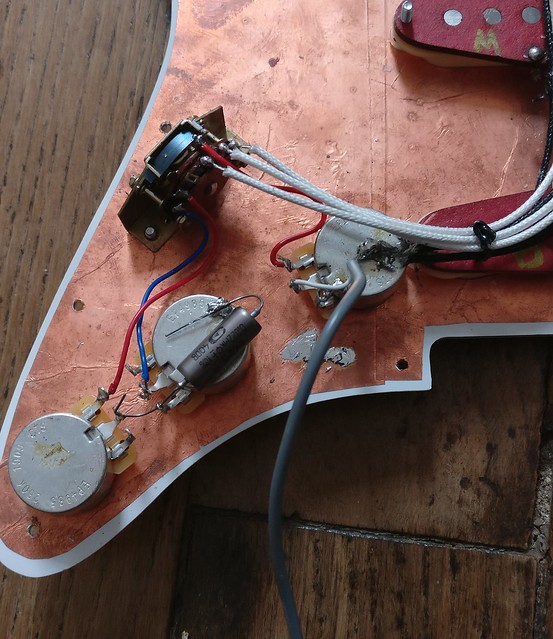 Je suis toujours à l'oeuvre sur ma Strat MIJ Eagle, il y a quelques semaines j'avais remplacé une partie de l'électronique pour du plus costaud, micros bobinés à la main Pribora Voodoo, potards CTS et condensateur PIO + blindage. Seulement voilà, j'ai des soucis avec mes potards de tonalité, ils ne fonctionnent pas, alors que celui de volume oui... Sinon, tout fonctionne, j'ai conservé le sélecteur 3 positions, introuvable avec ces cotes (et sinon il fallait que je change le pickguard).