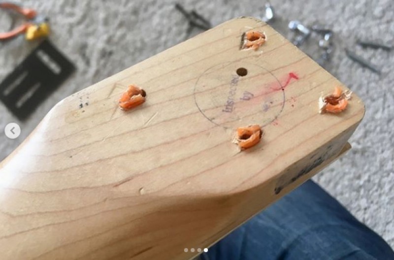 Je pense que si ton manche est bien calé, il n'y a pas besoin de refermer les trous des vis. En vissant les 4 vis en même temps, ça devrait marcher et ton manche ne plus bouger.