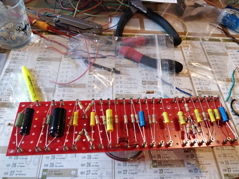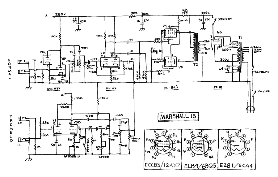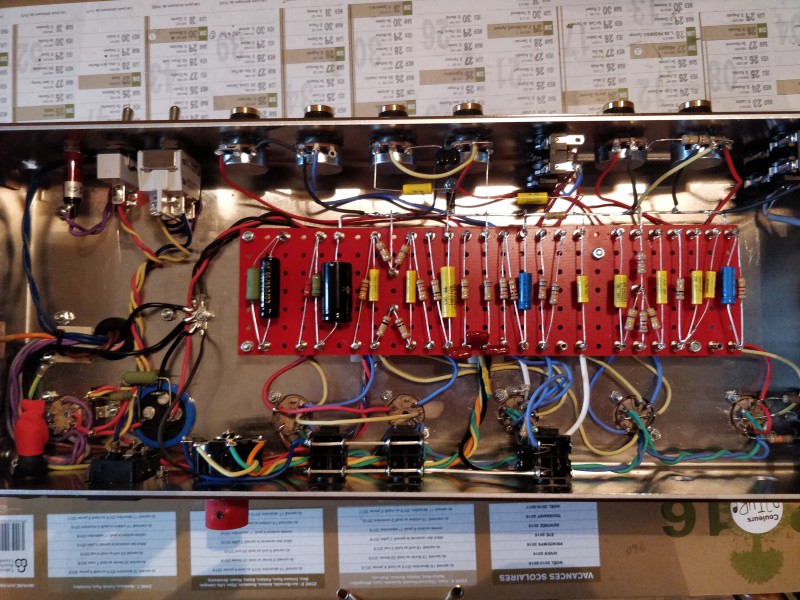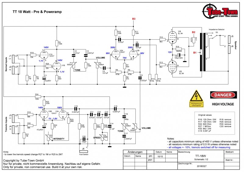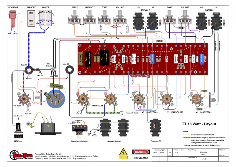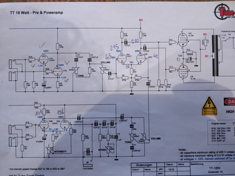 Bonjour, en ces temps où l'on doit rester à la maison je me suis lancer dans le projet de me faire un deuxième petit amplis à lampes, il y a quelques années je m'étais fais un clone de 5F2A Qui ne m'a jamais quitté depuis, aujourd'hui j'avais envie d'un son plus anglais et je me suis tourné vers un clone de Marshall 18w 1974. Sachant que j'allais rapidement m'ennuyer j'ai pris le partie d'essayer un kit Tube Town que l'on peut trouver à cette adresse [/url]https://www.tube-town.net/ttstore/tt-kit-marshall-style-18-watt.html. Pas de problème spécifique tout est là, tout semble de bonne qualité. Je vérifie tout mon truc et je test, le canal normal fonctionne bien, bien que ça crache plus que ce que je pensais. Par contre lorsque j'essaie le canal tremolo, là rien ne vas plus.