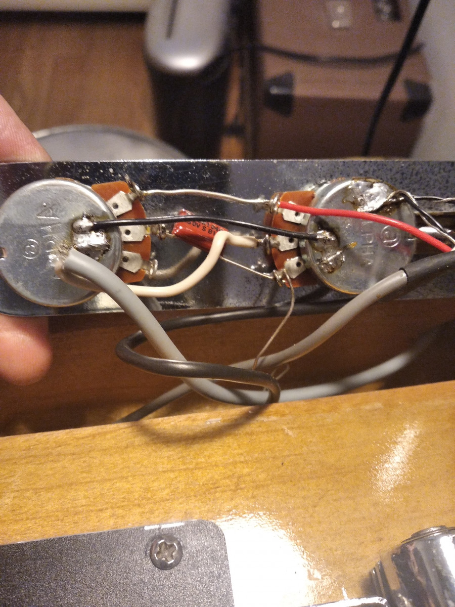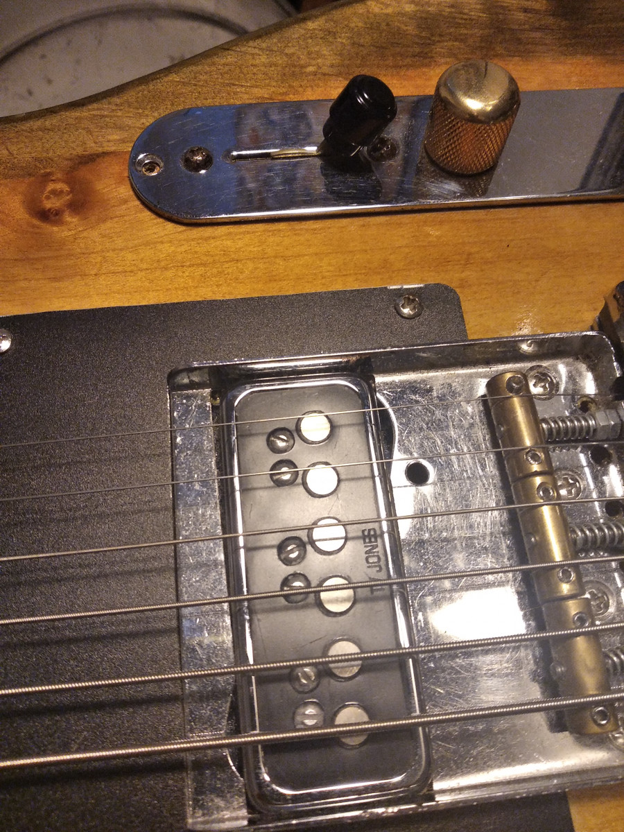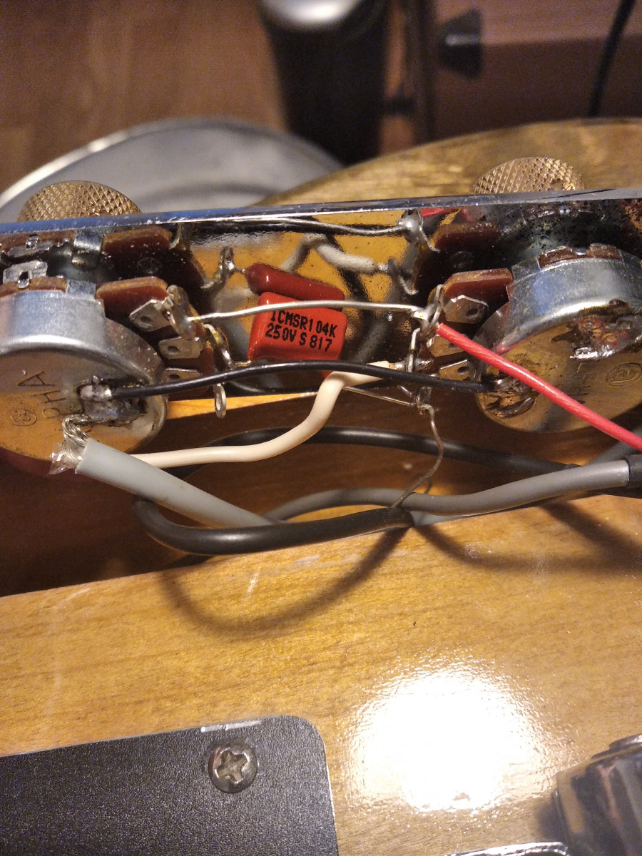 C'est ma bariton, je joue essentiellement en son clair. Je ne me souviens plus de la valeur du potentiomètre, 500kg ou 1 M, j'ai testé plusieurs condo , 22nf, 33nf, 47nf, et au final un 100nf dans mon cas.