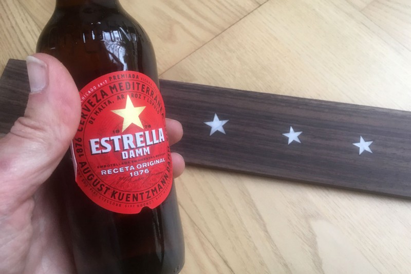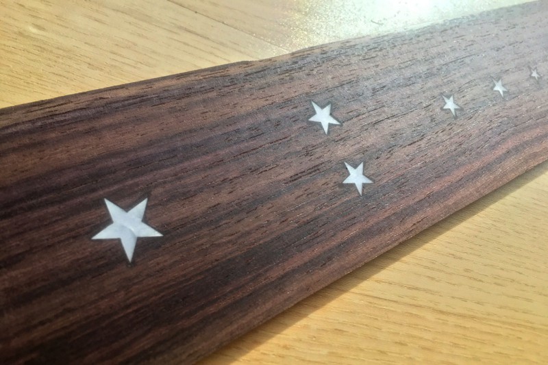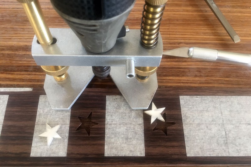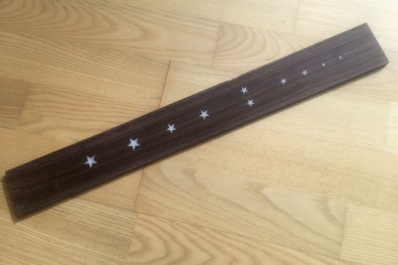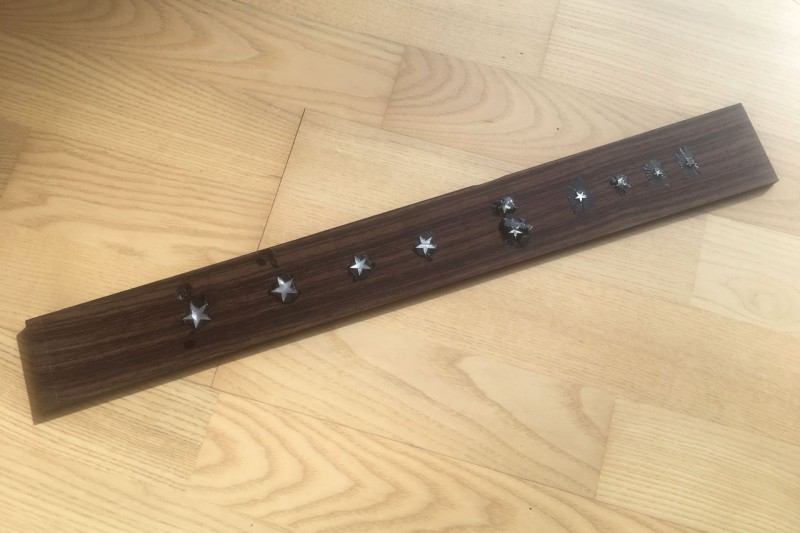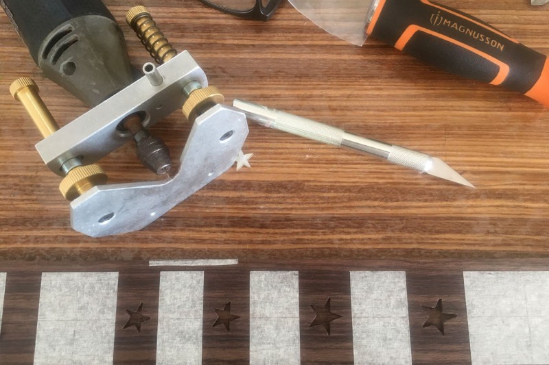 Oui c'est fait à "main levée". J'ai positionné les étoiles et tracé les contours au scalpel. Puis creusage à la dremel avec une fraise carbure de 1mm. Les bords sont faits au ciseau à bois de 6mm (c'est ce que j'ai trouvé de plus petit chez Casto).