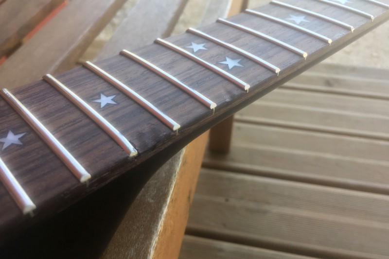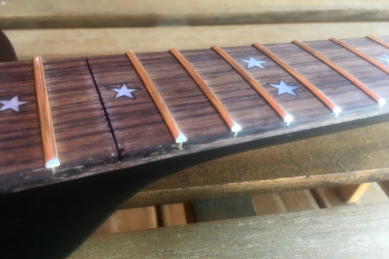 La 15ème frette est à changer. Ça c'est pas le problème. Par contre la touche, je vois pas trop comment réparer le plus discrètement possible. Epoxy ?