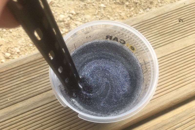 Puis on passe aux paillettes. Mélange avec le liant. Elles ont l'air tristounettes comme çà mais ce sont bien des holographiques. Les paillettes pour ça c'est chiant : il faut du mouvement et du soleil sinon ça rend pas grand chose.