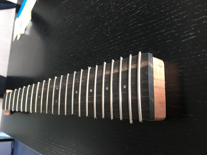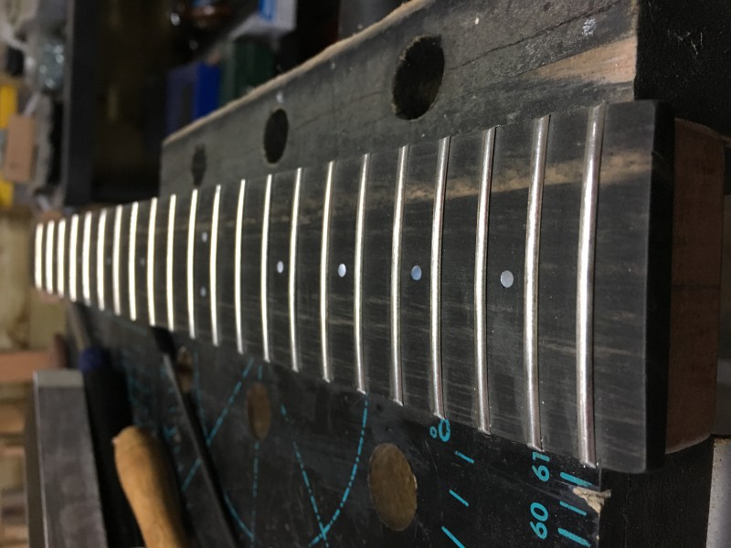 J’ai terminé la planification des frettes. Bon, c’est pas fantastique, ils sont tous bien de niveau mais pour retrouver ensuite une forme arrondi c’est chaud. Ils sont un petit peu plats sur le dessus, mais je pense que c’est acceptable.