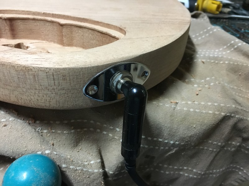 Enfin, j’ai fait le trou pour l’embase de jack. Encore une jolie pression pour réaliser ce petit tunnel à la mèche plate de 20mm, le tout étant fixé par la plaque