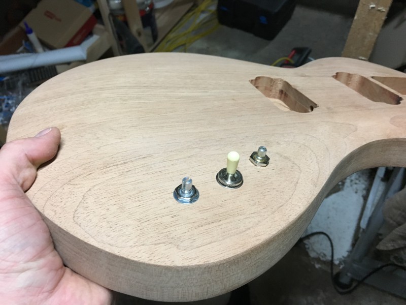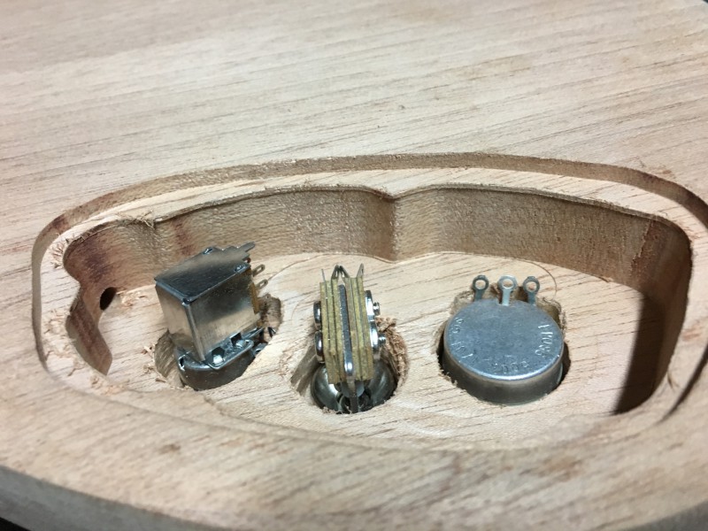 Puis j’ai évidé à la mèche plate et au ciseau à bois l’emplacement des potards et du switch. J’avais bien la pression, car j’ai pas pris des tiges longues pour les composants et j’aurais dû ! Je suis venu à environ 10mm de la table