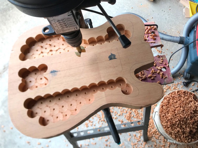 Je fais une Thinline argentée (à la feuille d'argent, enfin simili mais je veux ce rendu un peu particulier avec cet aspect pas complètement lisse) en Bosse (bois d'afrique), manche et touche érable. Au niveau des micros je ne sais pas trop ce que je vais mettre. J'hésite encore beaucoup...