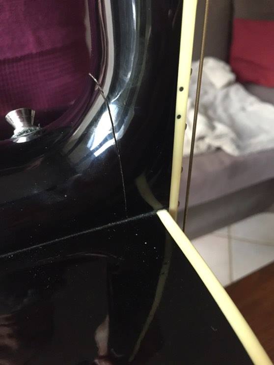 Un copain qui débute la guitare est passé me voir hier avec son epiphone acoustique, en faisant un check-up rapide de la gratte, j'ai remarqué que la jonction entre le manche et le corps présentait un défaut que je vous laisse constater en photo :