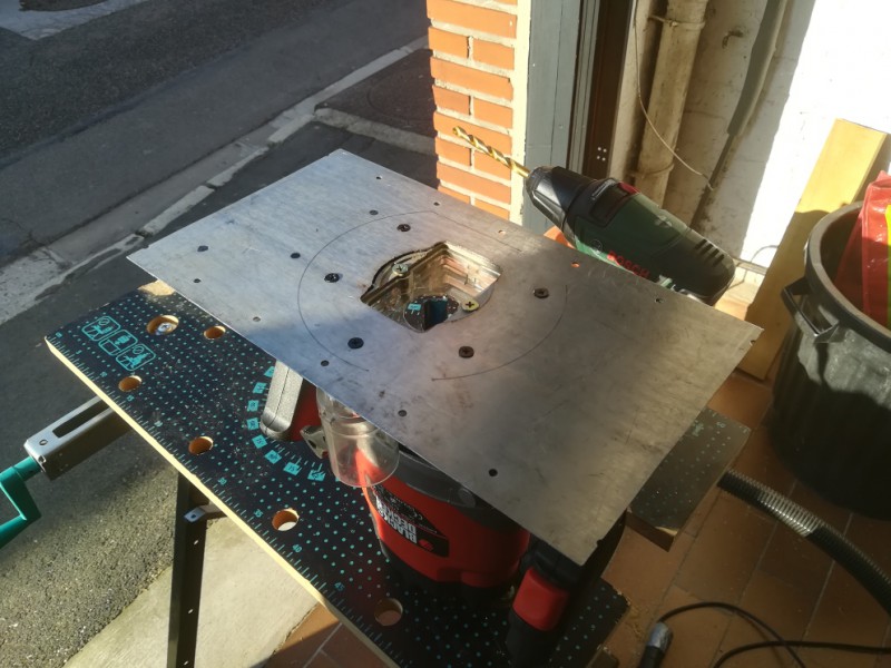 Puis j'ai travaillé à adapter un support pour ma défonceuse, afin conserver la planéité sur de si grosses défonces, j'ai donc fait ça dans un vieux bout d'alu de récup, pré-perçage puis découpe à la scie sauteuse.