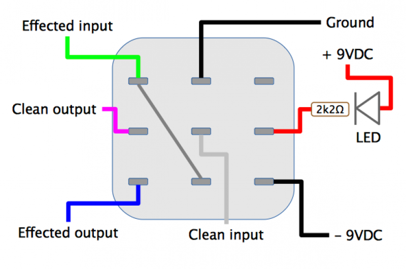 Si tu changes le footswitch DPDT par un 3PDT, tu utilises le 3° interrupteur pour l’allumage de la LED en même temps que la pédale et tu as une jolie LED d’état 3 couleurs.