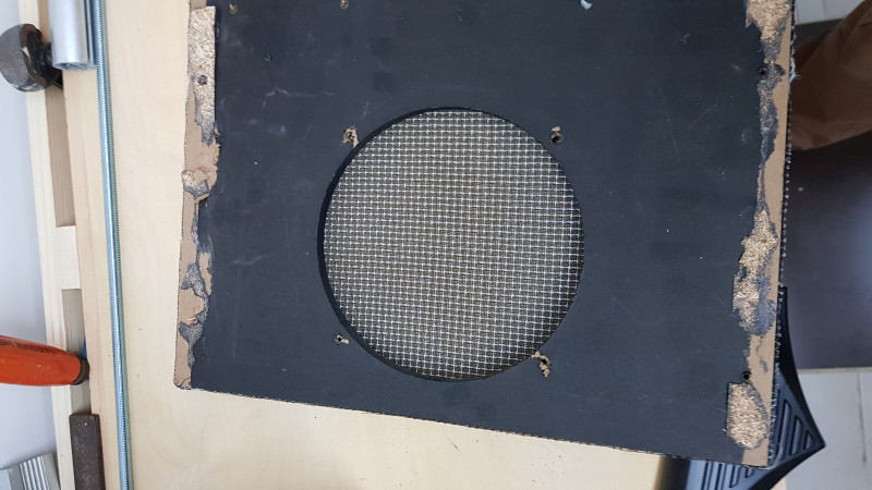 - j'ai zappé de prendre en compte l'épaisseur du grill-clothe lors de la découpe de la plaque HP, qui rentrait a forcer pile poil, mais sans la protection. j'ai du réajuster a la scie sauteuse et on vois que ce n'est pas symétrique