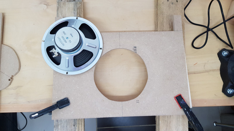 Ensuite, découpe du panneau avant accueillant le HP, avec les deux oreilles pour compenser l'élargissement de l'ampli avec le montage collé/vissé