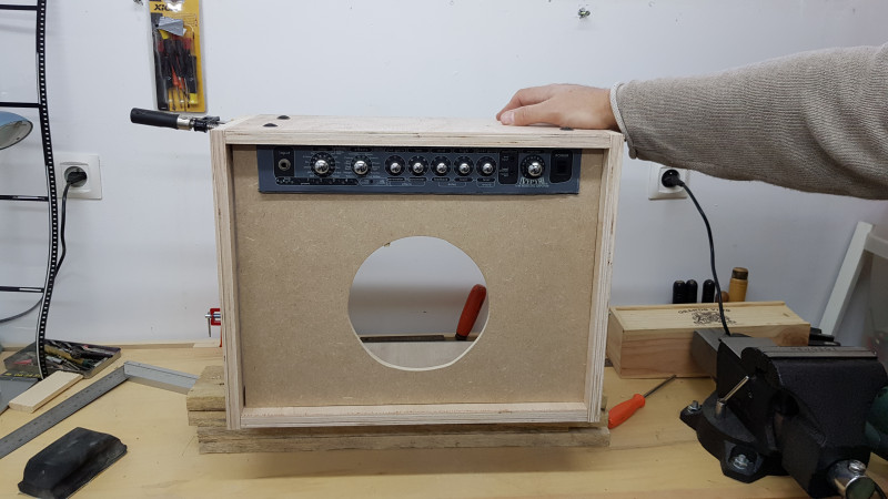 puis montage après avoir percé les trous pour maintenir l'ampli et la poignée