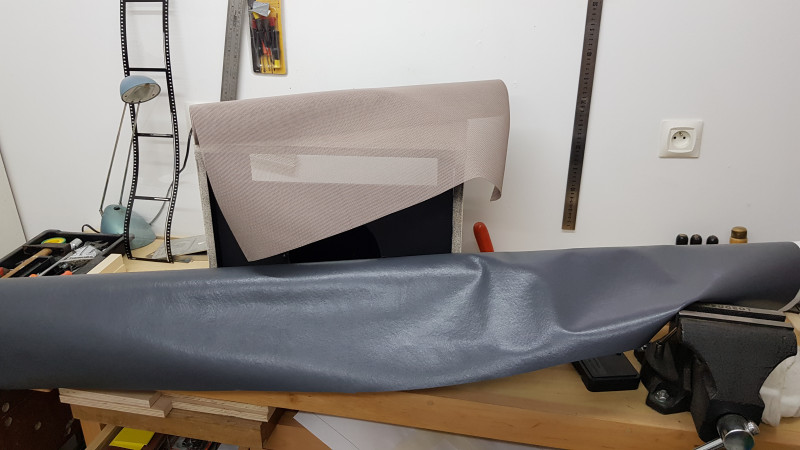 vient ensuite la découpe du grill clothe et du tolex. Direction le vendeur de tissus du coin, après conseils, je pars sur du simili cuire et du tissus pour fauteuil de jardin.