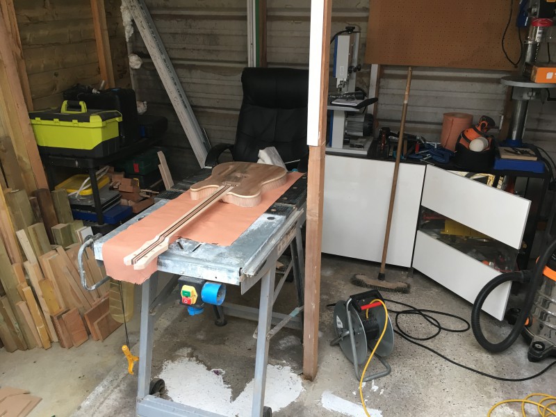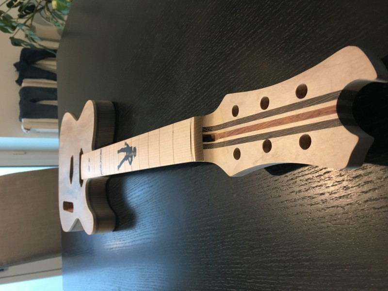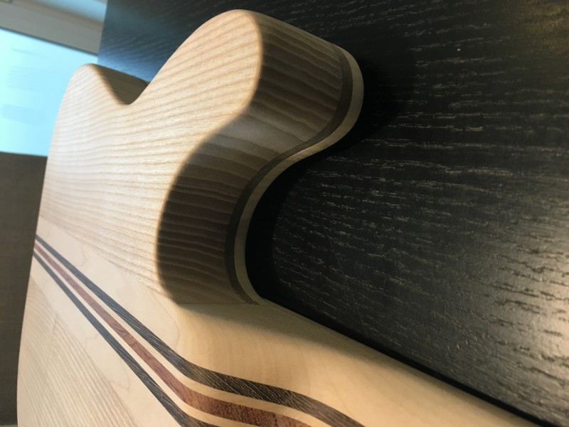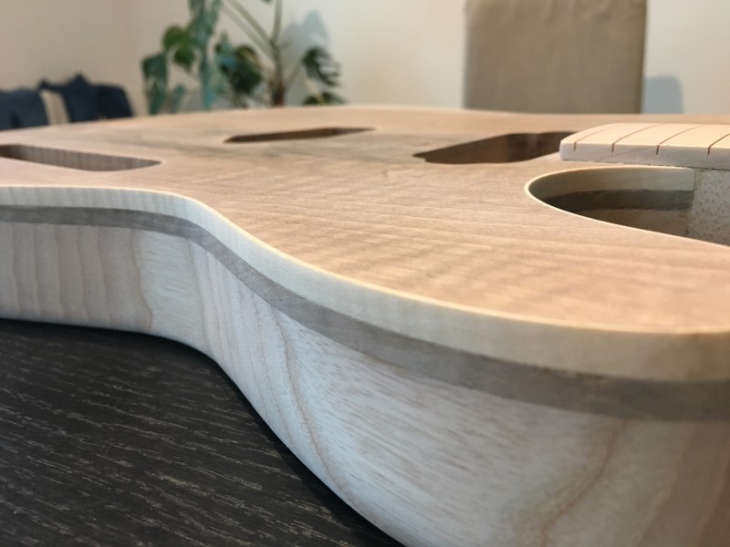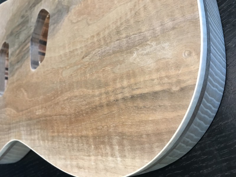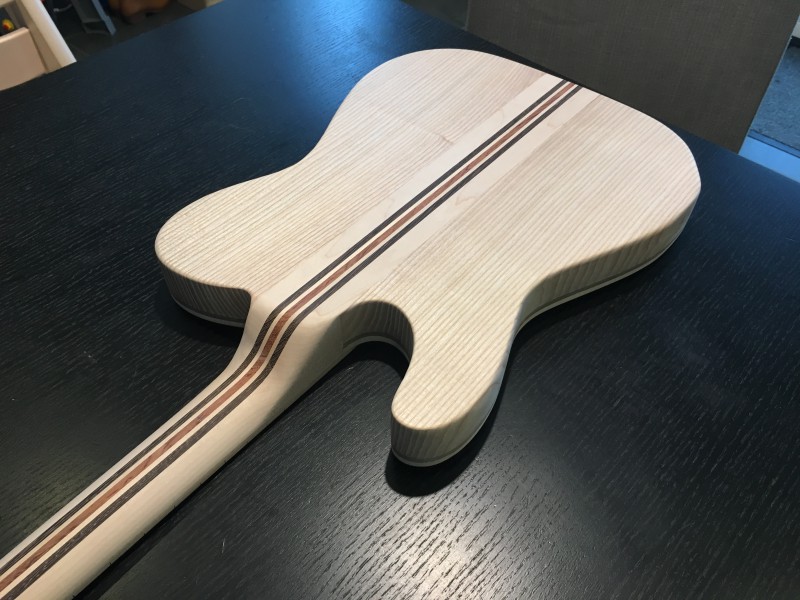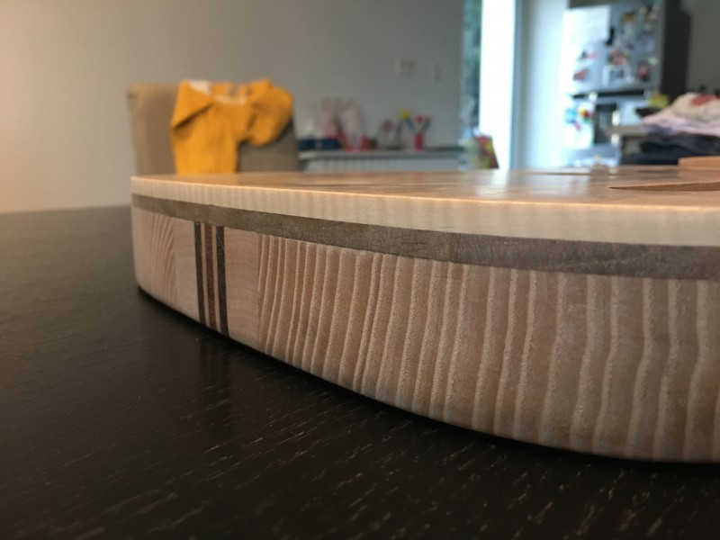 Avant et après le collage de la touche, j'ai passé de nombreuses heures à poncer soigneusement toute la guitare au 80, 120, 180, 240 et enfin 320. Je prévois un léger ponçage final au 500 après humidification pour dresser les dernières fibres.