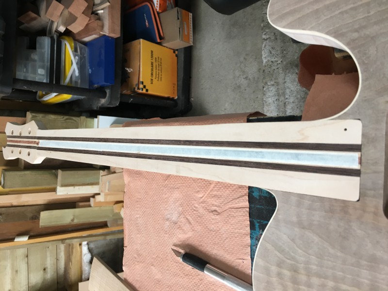 Ensuite j'ai réajusté mon canal de truss rod, percé son accès et installé l'engin en vue du collage de la touche, non sans le protéger avant :