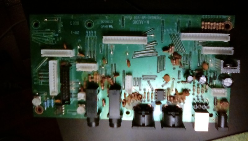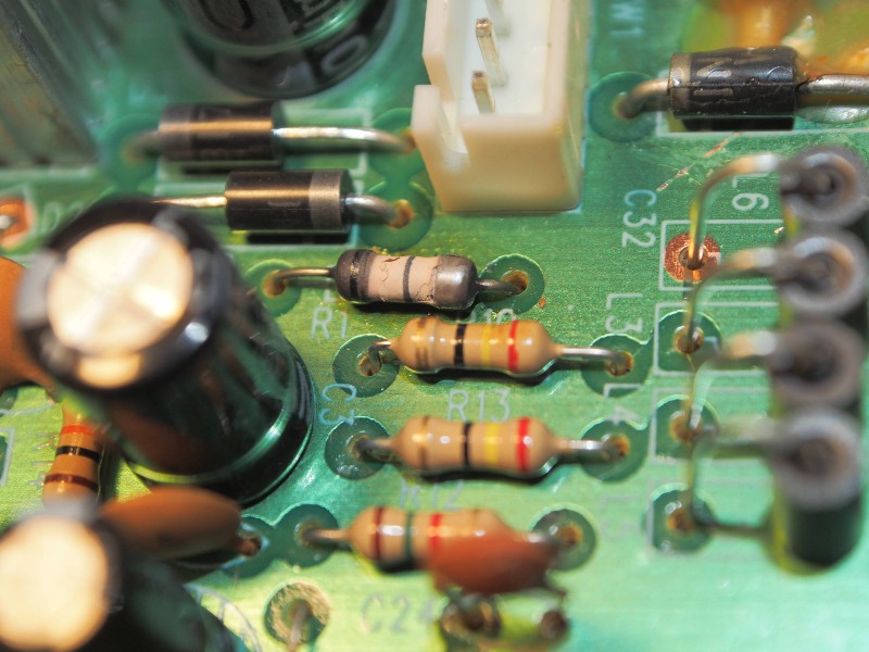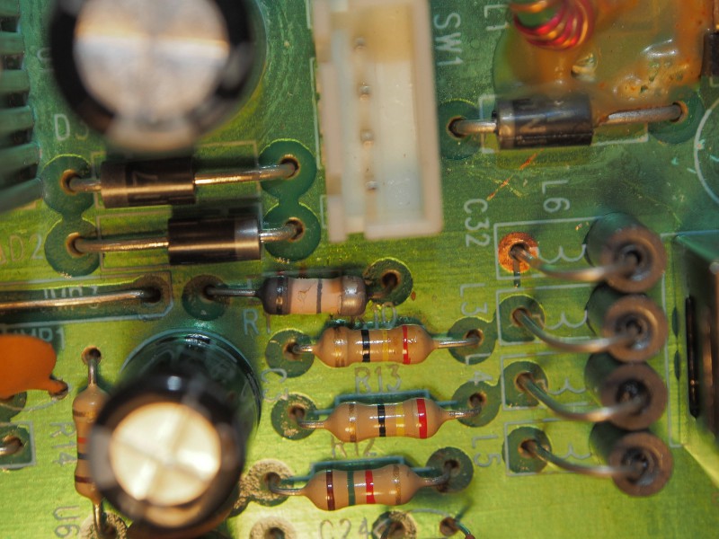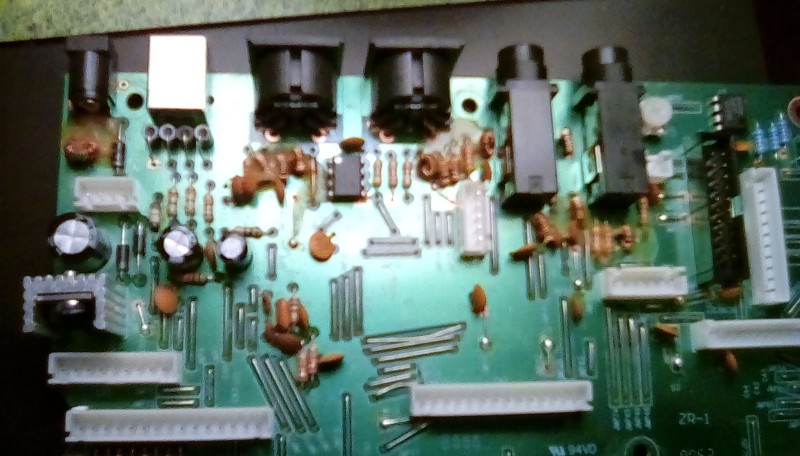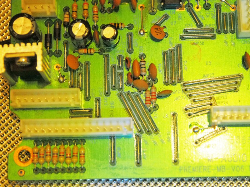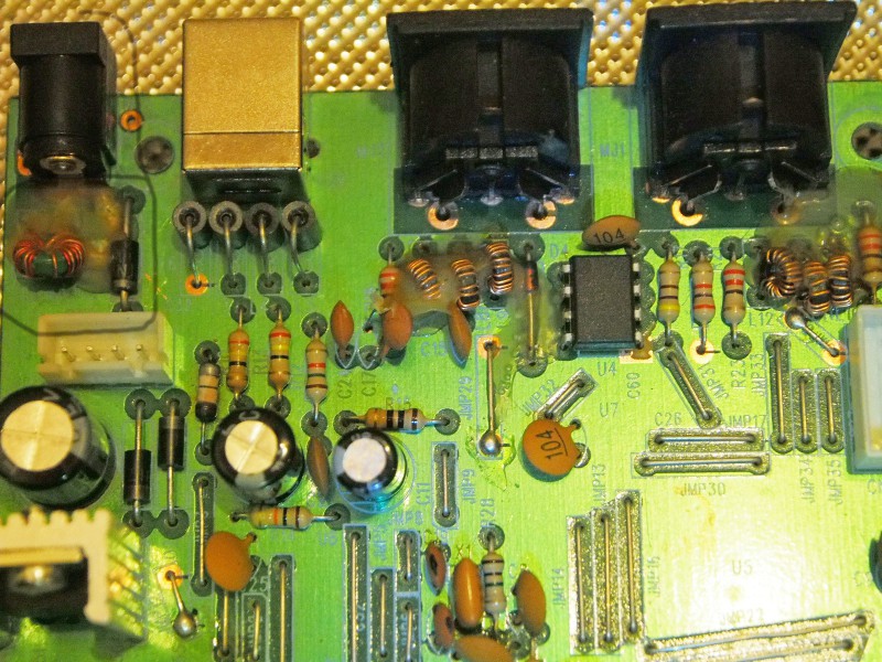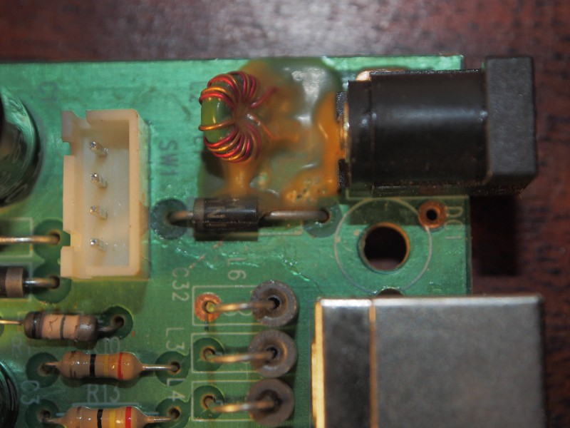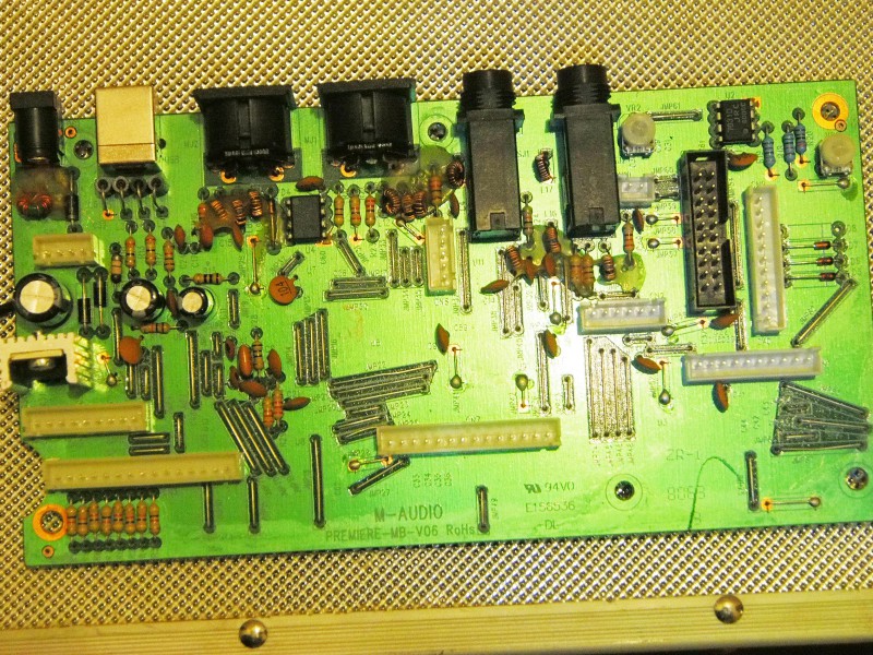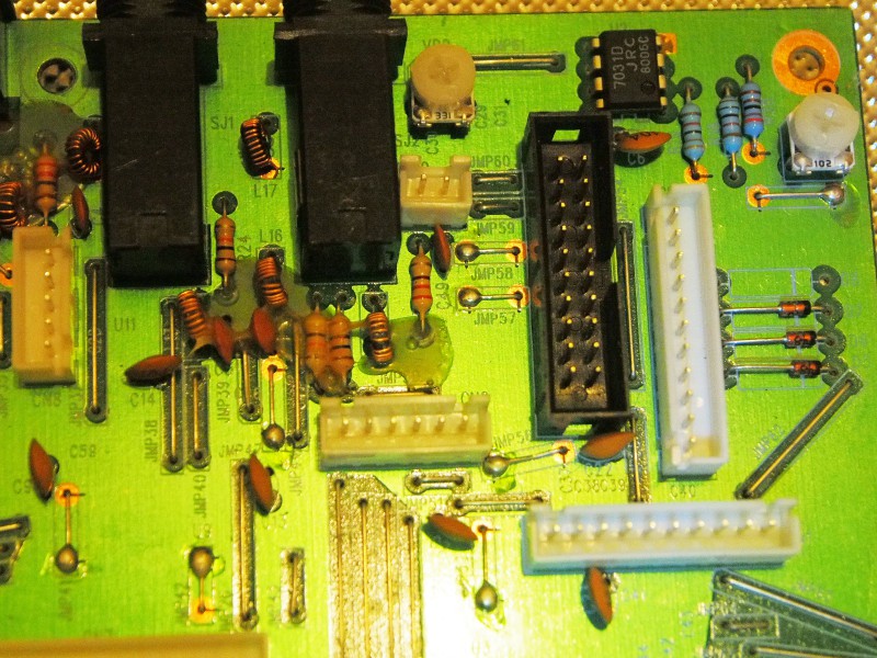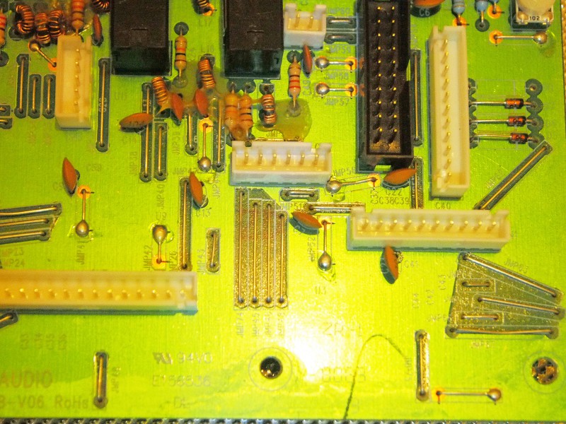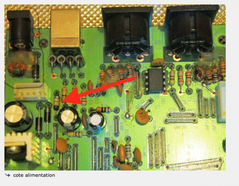 En haut à gauche niveau alimentation 12 v et usb, j ai testé au multimètre ce qui est entouré et je n ai pas de signal sur la prise de connection, sur la petite résistance à droite et sur le truc entouré de cuivre à gauche..