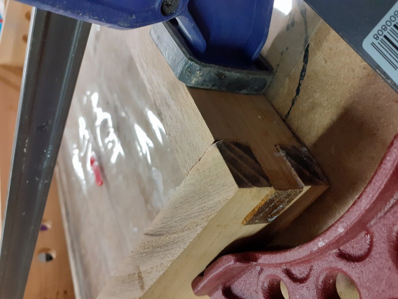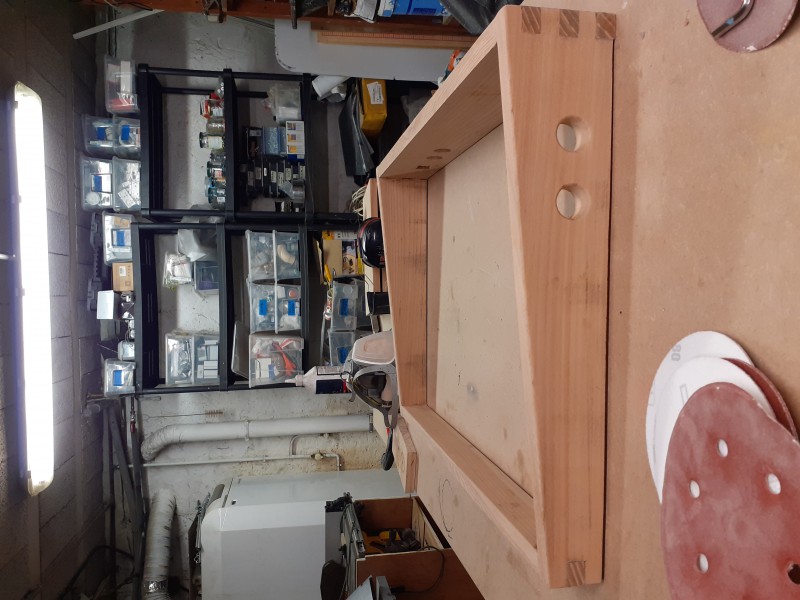 Assemblage de l'ensemble par queues droites. Collage. J'ai passé pour la finition un vitrificateur mat incolore que j'avais en stock.