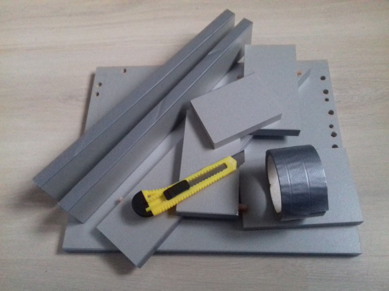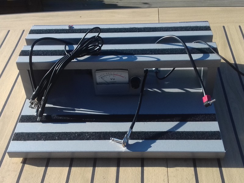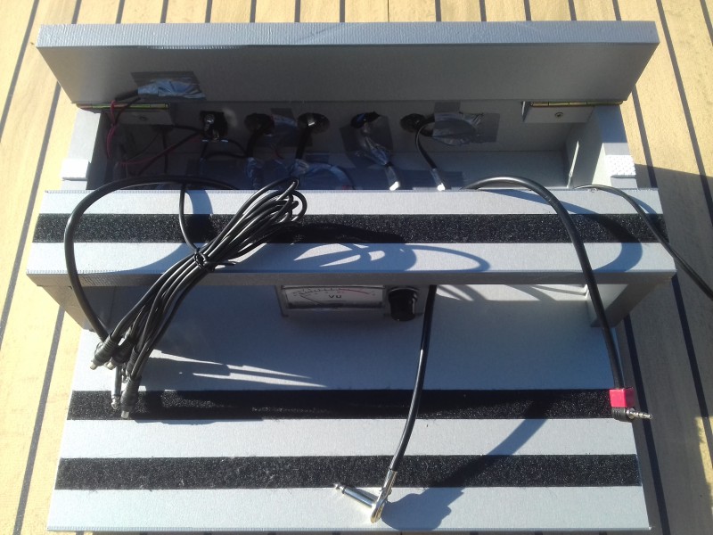A part les quelques jacks femelles et prises d'alimentation pour chassis, le gros de l'investissement était une tablette pour meuble, finition alu, de 80x40 cm, achetée dans un BricoPlanit (découpe millimétrée gratuite au magasin) pour un total de 11.90 €. Le vu-mètre à aiguille (un peu inutile vu sa position basse !) est de la récup, pour le look, des années 70.
