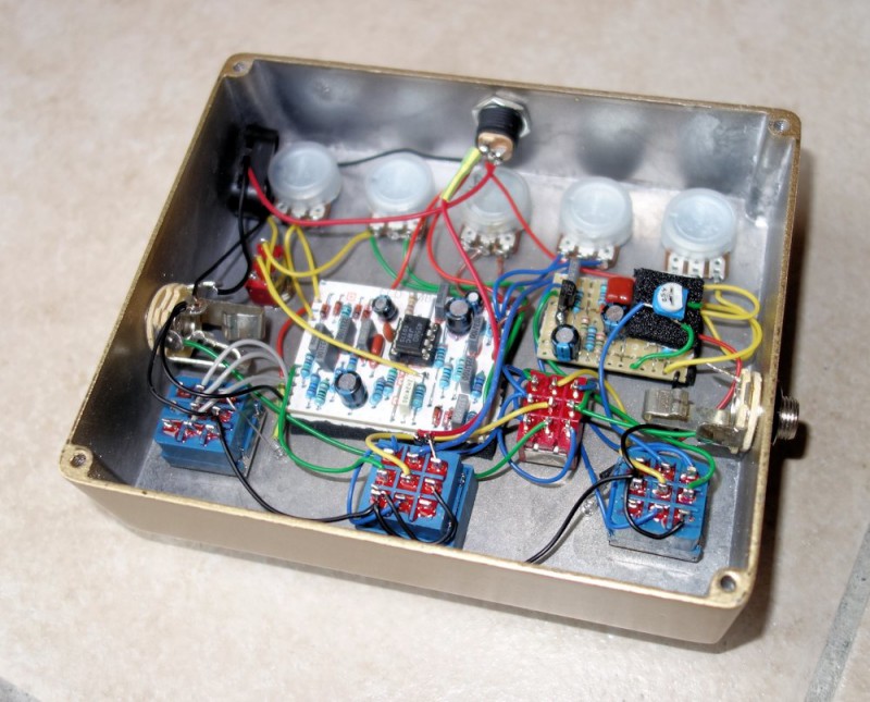 Au programme la CDD avec ajout d'un potard de médium (contour), le gain boost accessible au pied, et un 3ème footswitch pour un boost, le Bearfoot Baby Pink Booster, que j'ai aussi modifié pour qu'il puisse débooster (d'origine boost à 0 on est à l'unité).