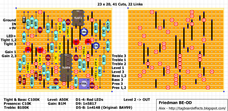 si tu met environ 2k ca devrai le faire mais cherche un peu dans les schéma par ex sur pedalpcb ou autre pour etre au plus proche