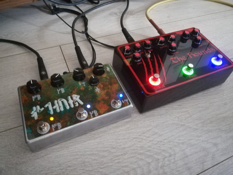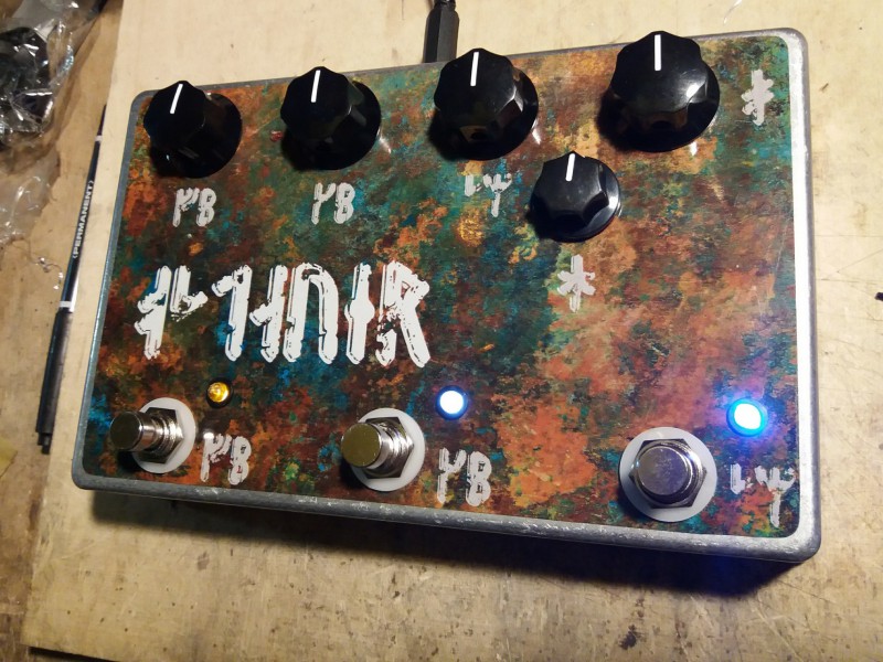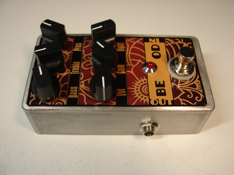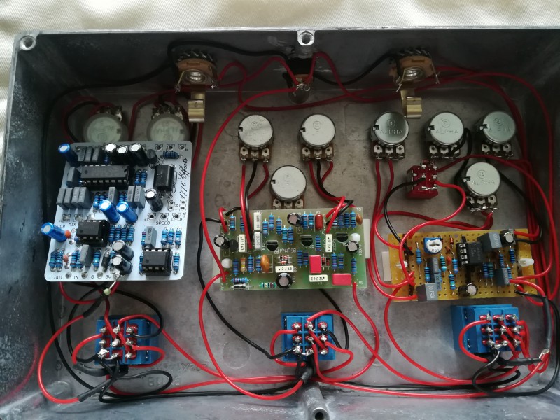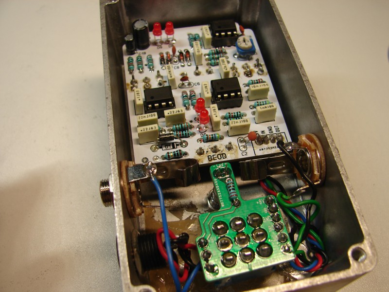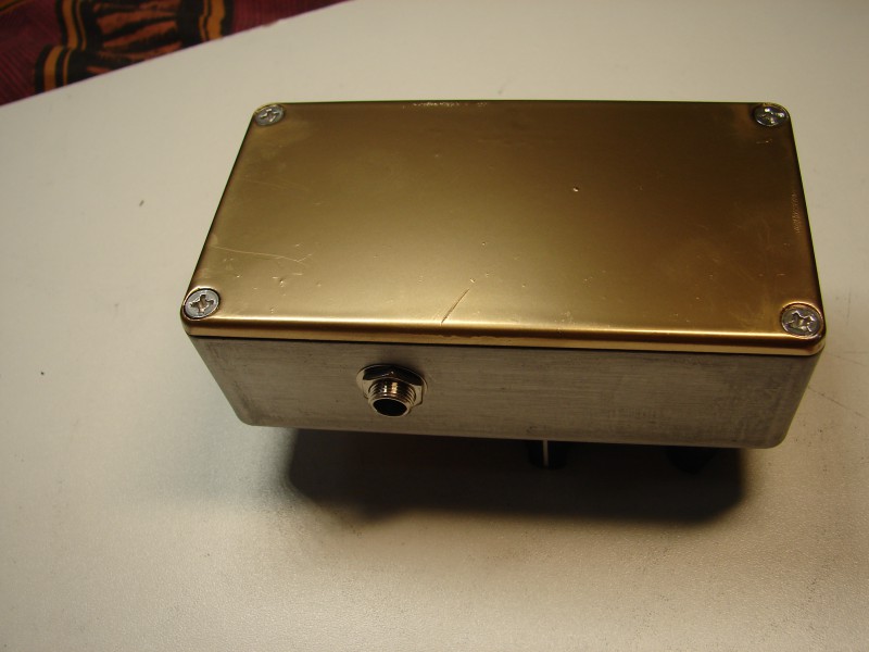 elle fonctionne du premier coup. finalement j'ai mis les diodes au lieu des doubles diodes...le son, bah, c'est terrible, mais faut pas mettre tout à fond sinon ça larsen (test pédale ouverte)... manque un poil de basses dans les très basses fréquences, je trouve, peut-être dû justement aux 4 diodes simples)...