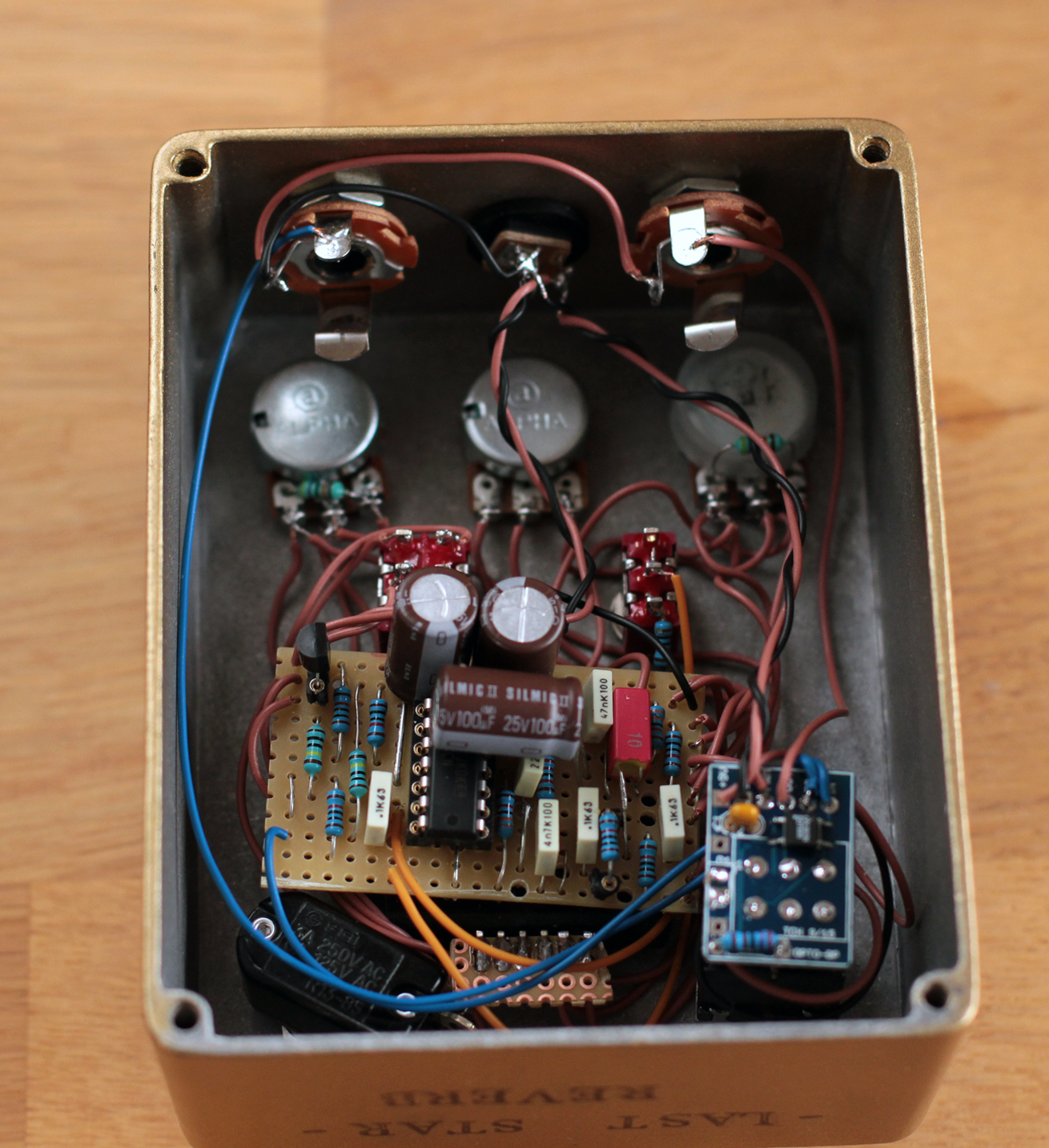 Et cette réverb est EXTRA, je la préfère à mon clone de Ghost Echo modifié que j'adore pourtant. Le feedback est nettement meilleur que sur la Ghost Echo, à fond il entre en oscillation sans jamais se mettre à hurler, c'est très agréable. Et le réglage de tone permet d'aller d'une réverb très sourde à une réverb très brillante.