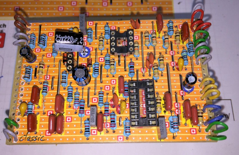 Schéma de Sonelec Music, avec un condo + deux diodes par sorties pour l'isolation.
