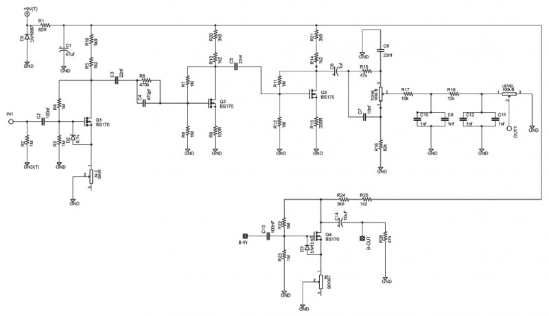 Deuxième chose... Je souhaiterais pouvoir placer le boost avant OU après le drive, séléctionnable via un petit switch à bascule. Quelqu'un a une idée de comment faire ça? Je me suis un peu creusé la tête, mais le seul moyen que je trouve est avec un 4PDT, et ça prend une place de dinque dans un 1590b.