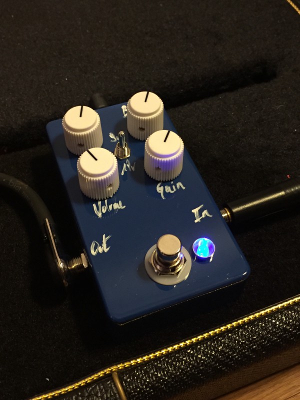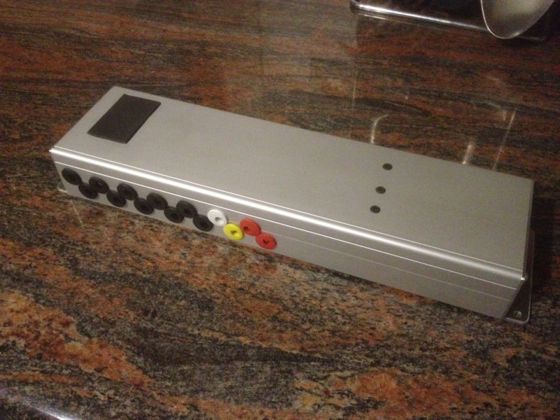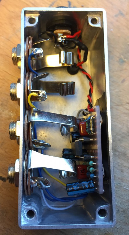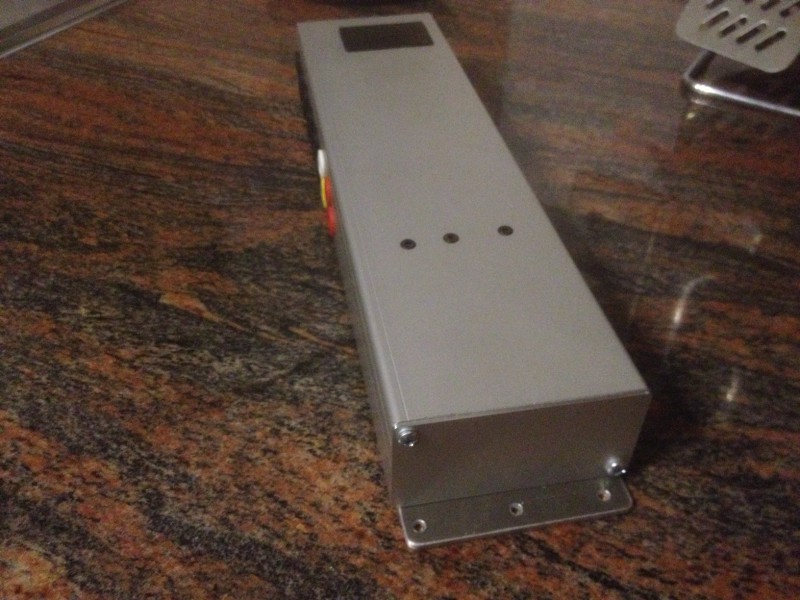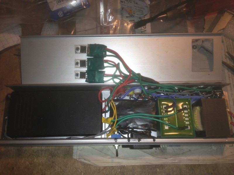 J'ai jouté une petite tôle alu dessous, avec vis à têtes fraisurées noyées dans l'épaisseur de la tôle et boulonnées dans le boitier, pour permettre de pouvoir visser ça au dessous du pedal Board, par 3 trous de chaque coté.