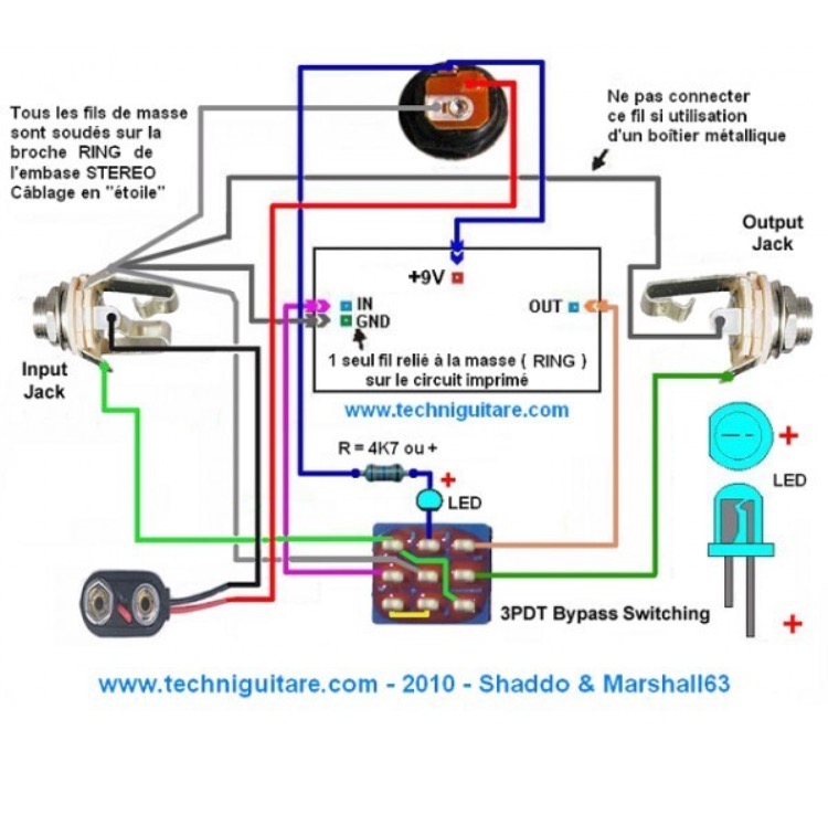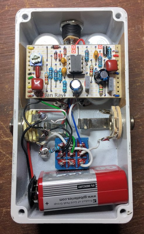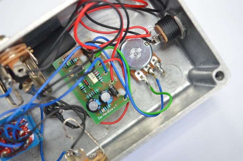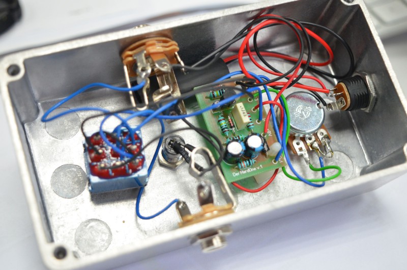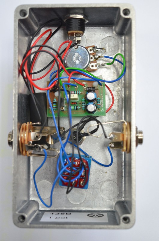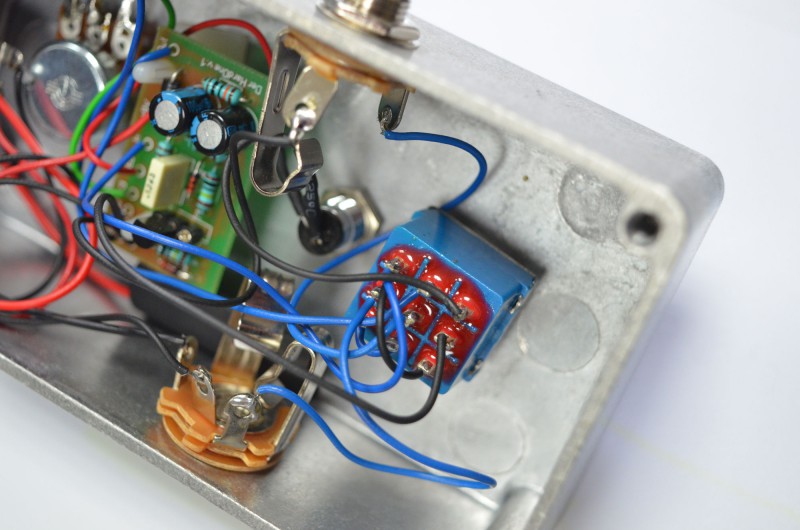 geogeo > En fait j'ai commencé par le bas, footswitches et toggle, tap jack, tap tempo board et relay bypass, les deux leds, et ensuite j'ai mis le circuit principal, avec des câbles partant vers le tone switch et le toggle pour l'option slam switch. Ensuite restait à mettre le circuit principal, les jacks in, out, dc et le tone switch. Et voilà !