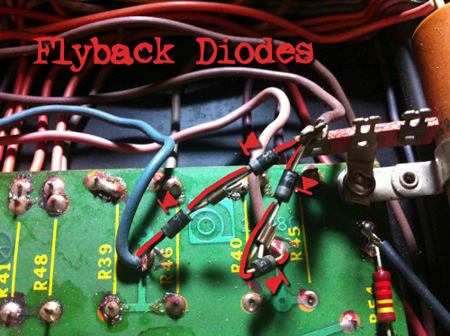 Pour l'auteur et aussi à titre de référence, voici à quoi ressemblent les diodes flyback dans une Ampeg V-4B, évidemment ça peut varier d'une année à l'autre, mais reste que ça devrait être similaire, une réparation aussi simple sinon plus que de remplacer une lampe.