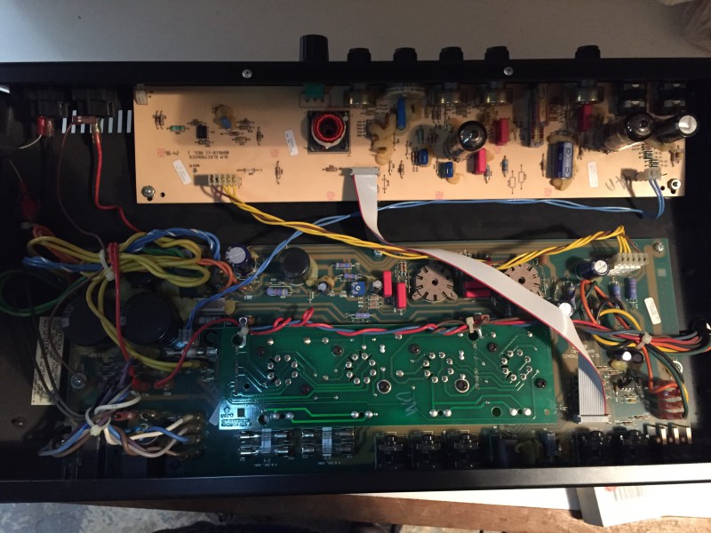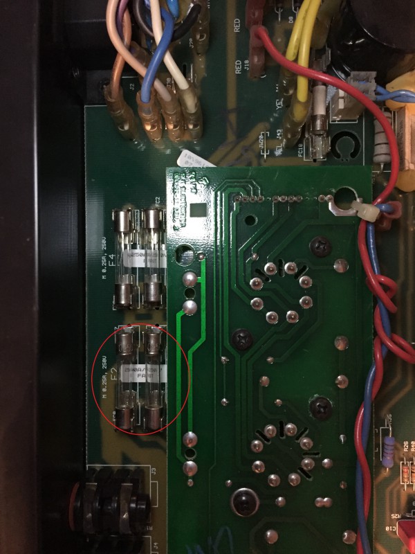 Bref j'ai seulement ouvert l'ampli aujourd'hui dans l'après midi et il y avait 2 fusibles fondus à l'intérieur (ceux entourés en rouge) :