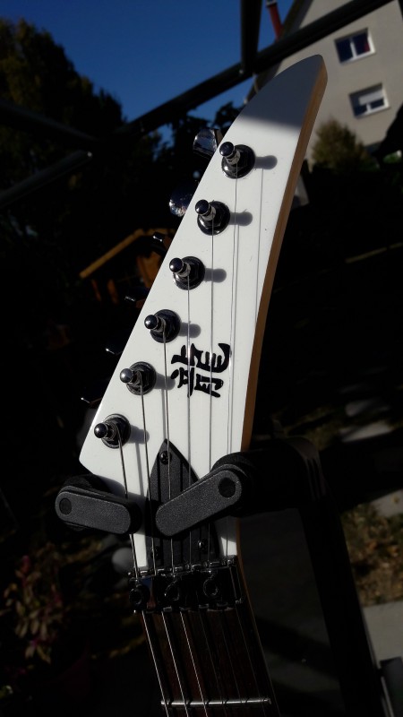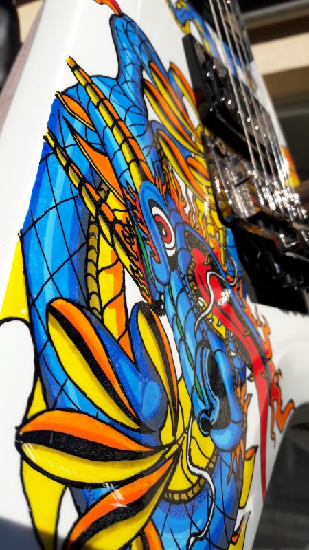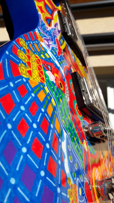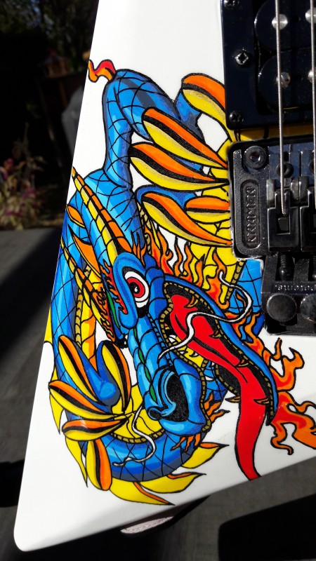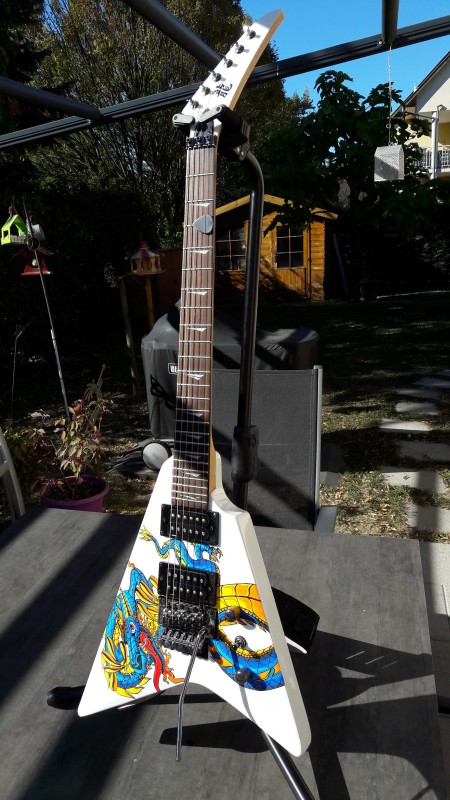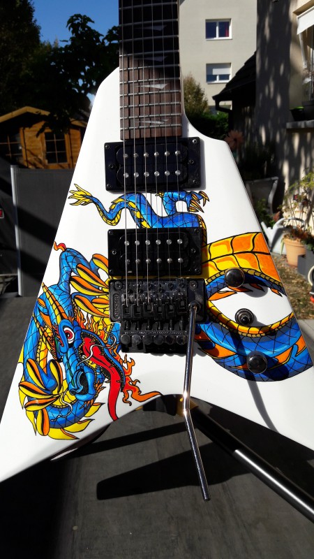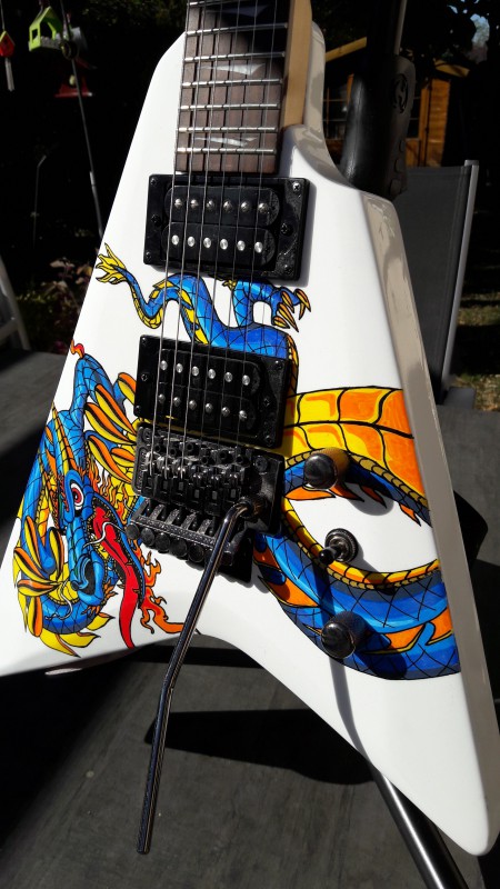 La seconde est une Kramer qu’on m’a donné et qui avait la junction tête/manche cassée. C’est une Vanguard flying V mais une des pointes était vraiment énorme et ne me plaisait pas. J’ai donc commencé par couper 15cm puis j’ai refais une déco avec peinture carrosserie blanche puis dessin aux feutres Posca puis vernis MOTIP encore. Elle été faite il y a 2 ans max et ça ne bouge pas non plus.