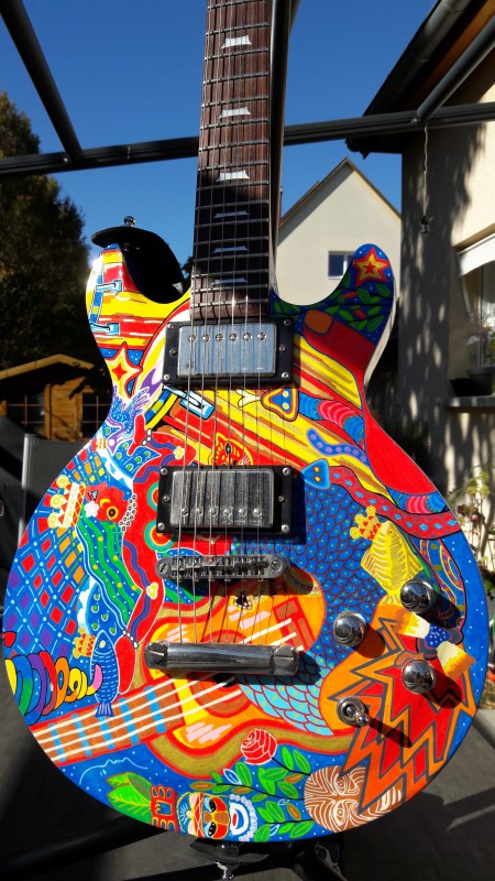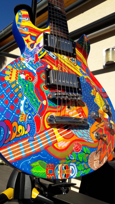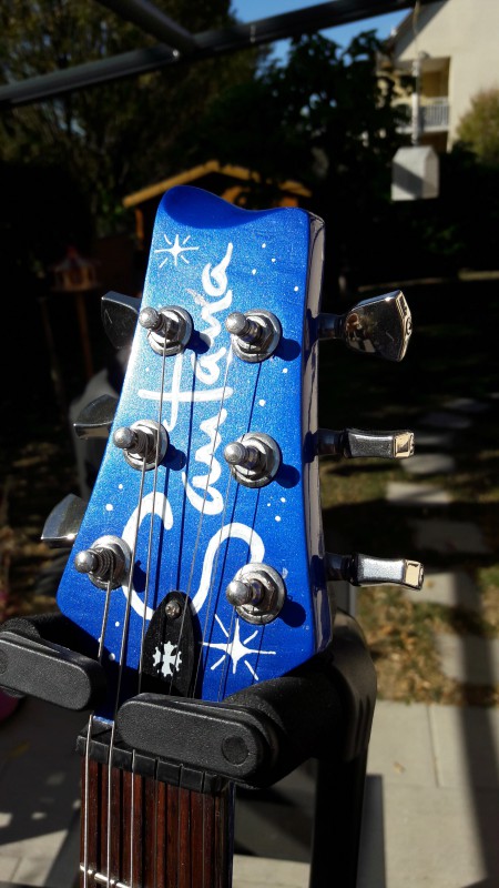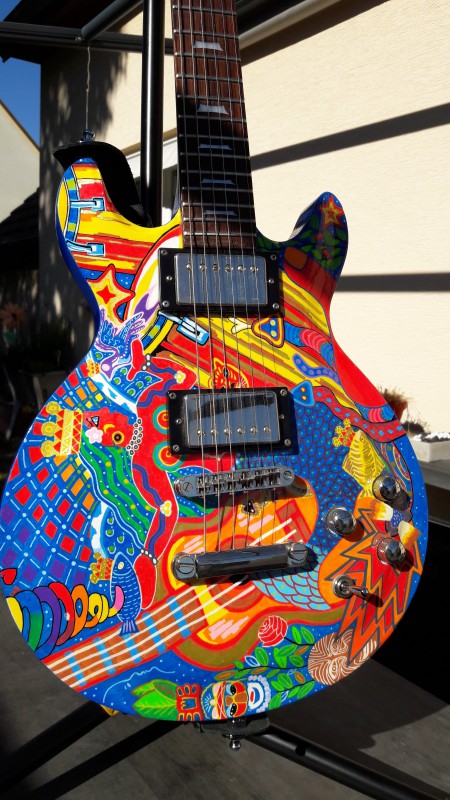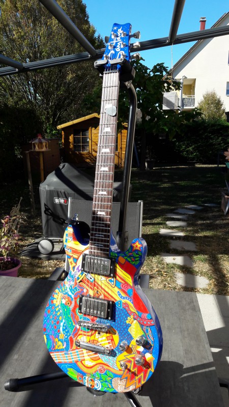 La première est une LAG Roxanne RS500 que j’avais acheté d’occasion (à l’origine en sundburst). Le dos et la tête sont fait à la bombe peinture carosserie voiture bleu métalisé et la table en feutres Posca. J’ai d’abord fais le dessin sur une feuille. J’ai copié la pochète de l’album de Santana “Supernatural”. J’ai passé peut-être une dizaine de couche de vernis bombe. Elle a été fait il y a bien 4 ans et le vernis n’a pas bougé. Pour info c’est bien 50 heures de boulot…