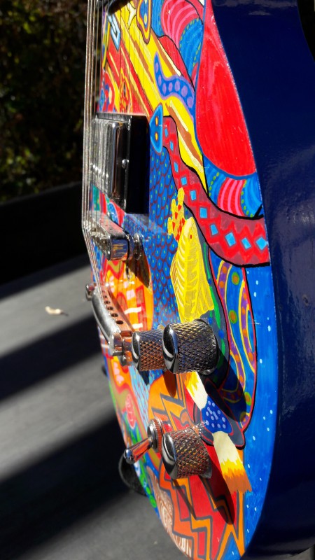 Comme ce WE le soleil était au rendez-vous, j’en ai profité pour faire quelques photos des 2 guitares pour lesquelles j’ai refais la décoration entièrement avec des POSCA + vernis bombe MOTIP.