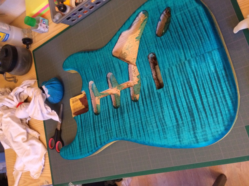 a peine attaqué le poncage,je suis passé a travers le vilain placage quilt de la coreene...n'etant pas a moi,je ne pouvais rendre l'instru a mon pote,comme ca.je me suis donc lancé dans la refection de cette boulette,apres des conseils recus ici par 10:15 et autres,merci a eux,qui m'ont permis de me lancer la dedans/