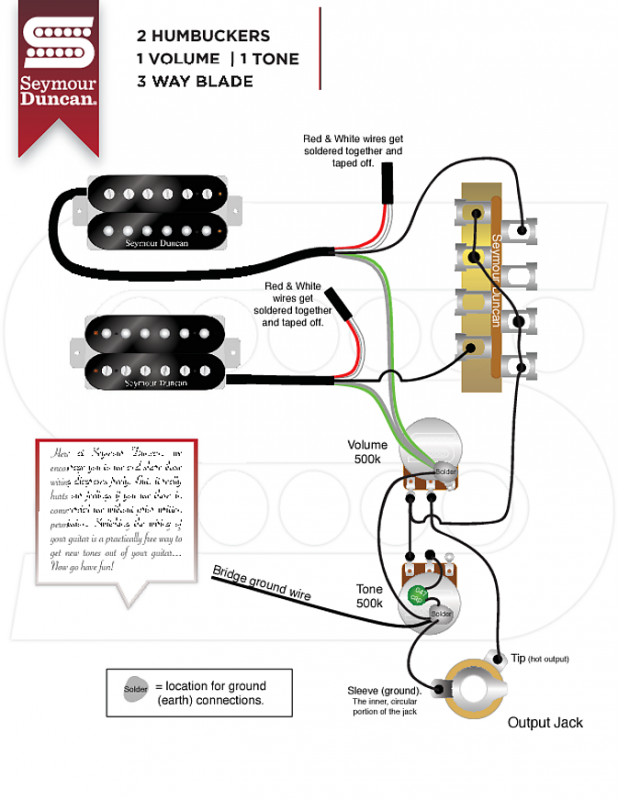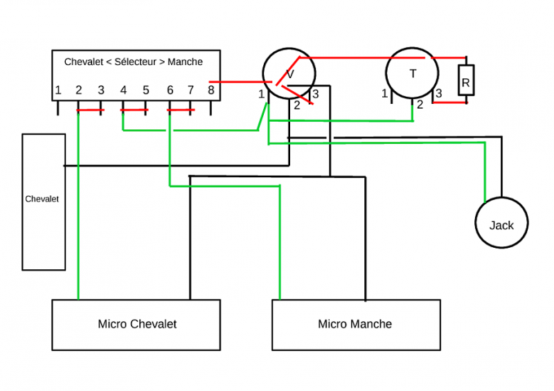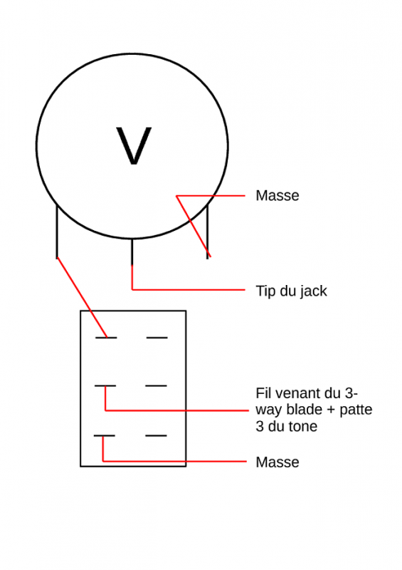 J'ai rapatrié mon matos pour souder chez moi ainsi que mon multimètre, j'ai donc cherché ou j'avais faux pour mon schéma du câblage existant dans la guitare et en fait il y avait un fil ou le  "shielding" (je ne sais pas comment on dit ça en Français) était utilisé pour la masse, et ayant mal regardé je croyais que c'était deux fils soudés ensemble, du coup le schéma donne ça :
