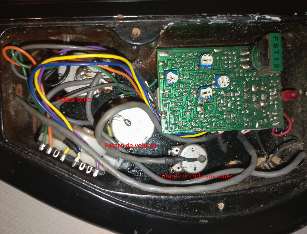 Je vais vous montrer l'électronique, peut-être que vous verrez quelque chose qui ne va pas. Attention : la guitare a un sustainer, ce qui la rend assez compliquée avec tous les nombreux fils.