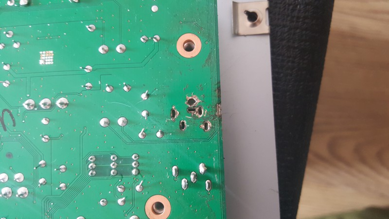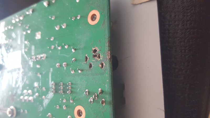 Chose faite avec un fer à souder low cost pas puissant. Sauf que voilà, j'ai galéré comme pas possible à enlever les soudures très minces, et le résultat n'est pas jolie du tout. J'ai dû insister. En plus j'ai ripé plus d'une fois. J'ai peur d'avoir endommagé le circuit (voir photos). Un trou m'a particulièrement posé soucis, impossible d'enlever la soudure donc j'ai forcé un peu et ça l'a agrandi.