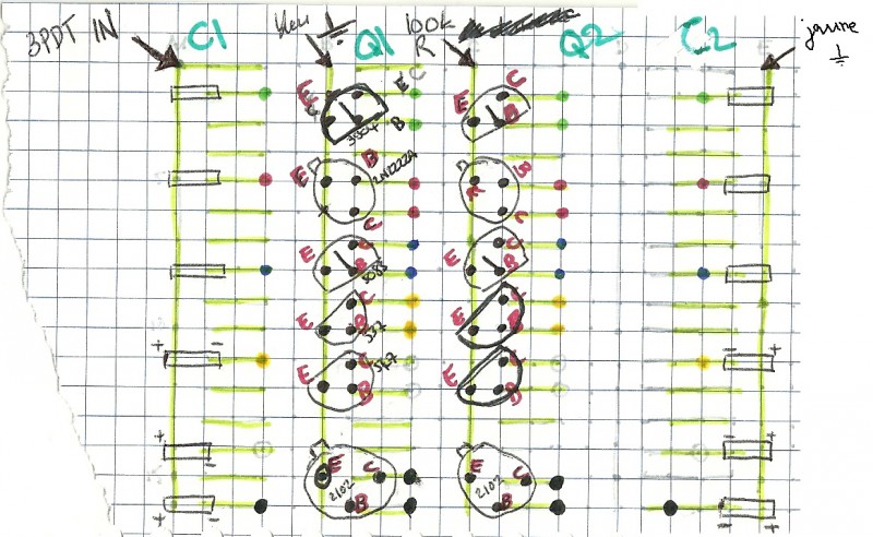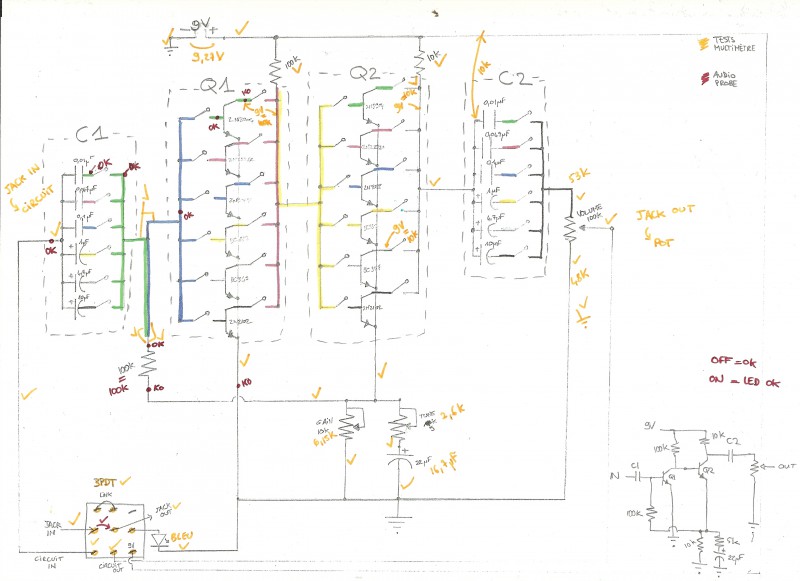 Voici le schéma de la pédale, ainsi que des tests que j'ai effectué au multimètre ou avec l'audio probe.