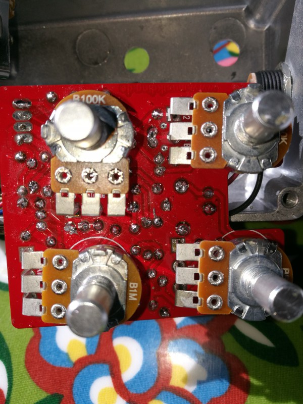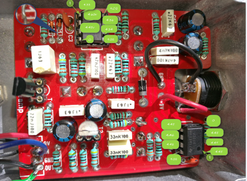 les potards j'ai tésté vu qu'ils se comportent comme des résistances les mesures correspondent aux inscriptions sauf je ne sais pas si cela a son importance mais le 1M lin qui correspond au gain,lui a été mesuré a 2.7 mega ohm au lieu d'1