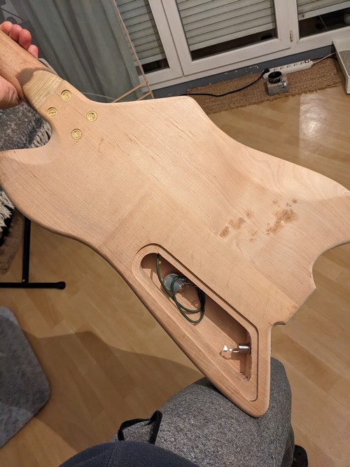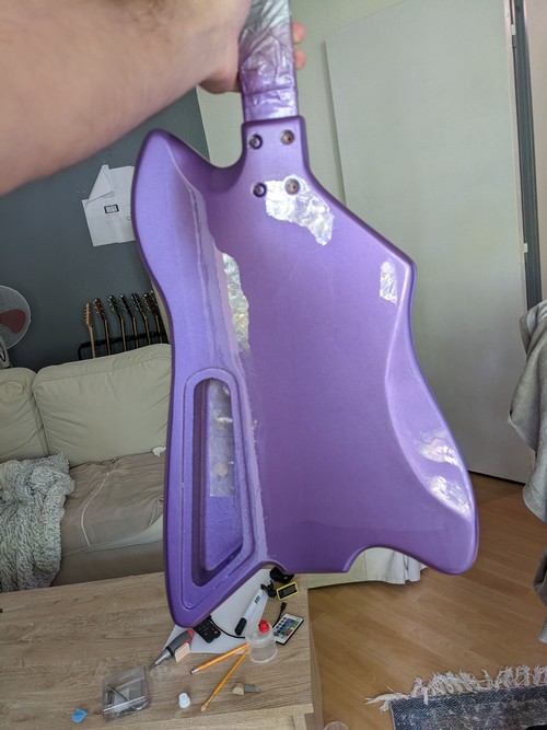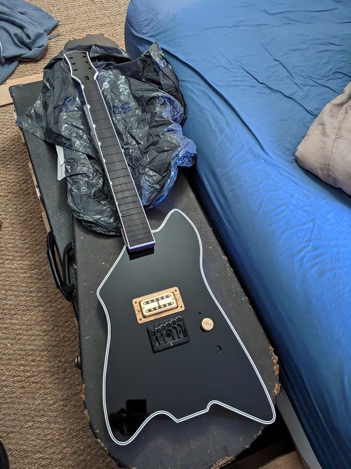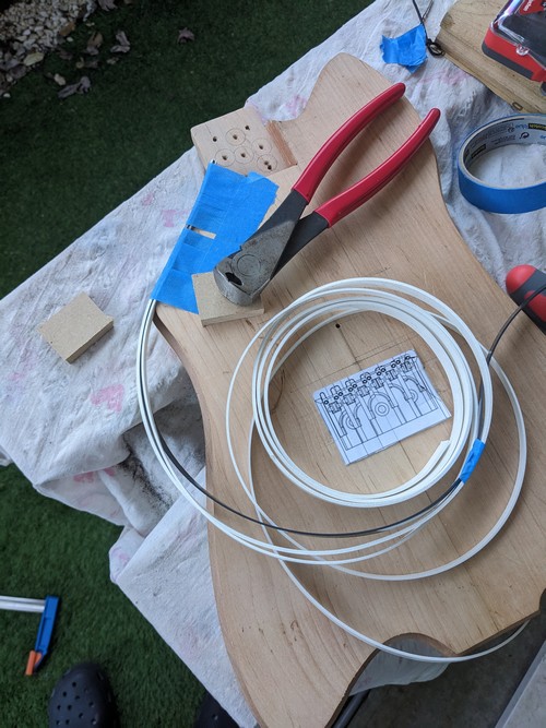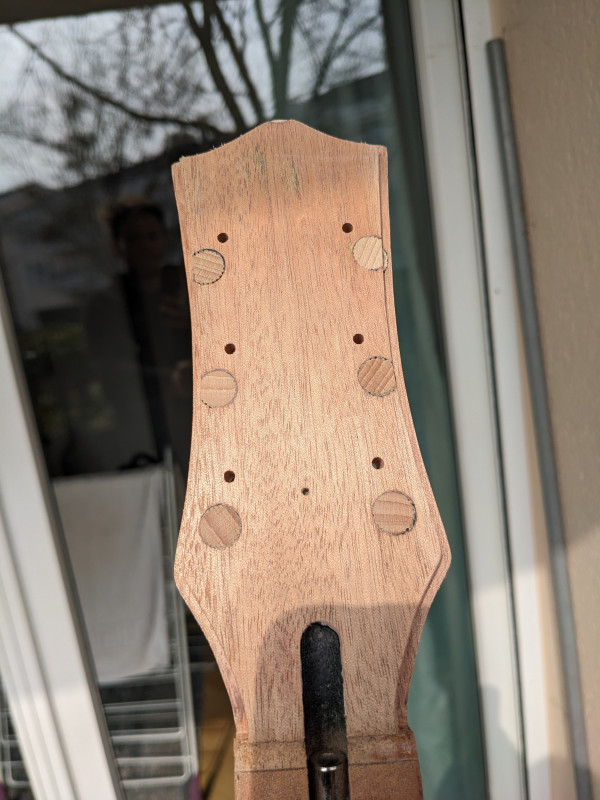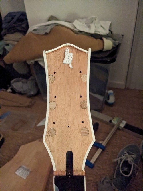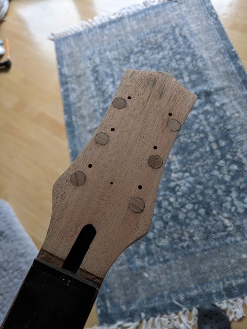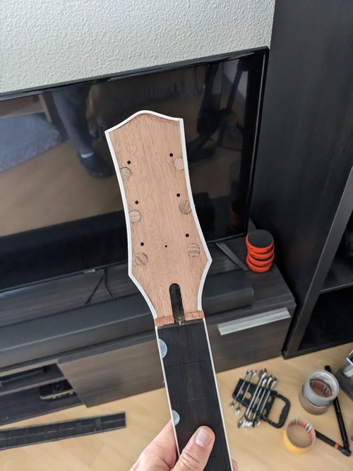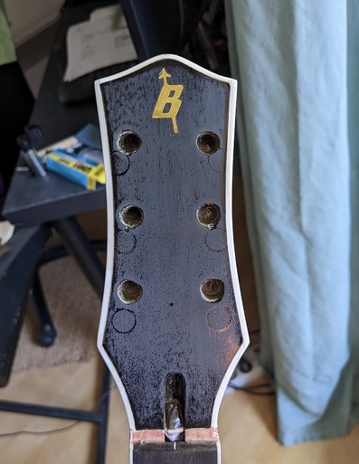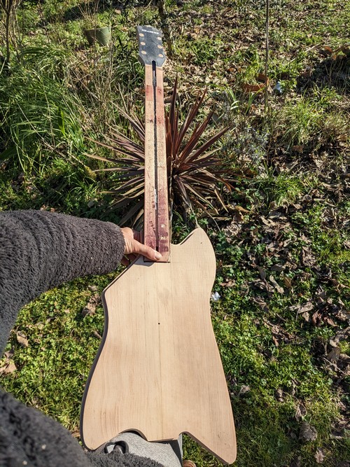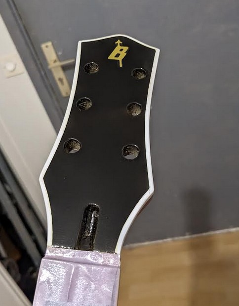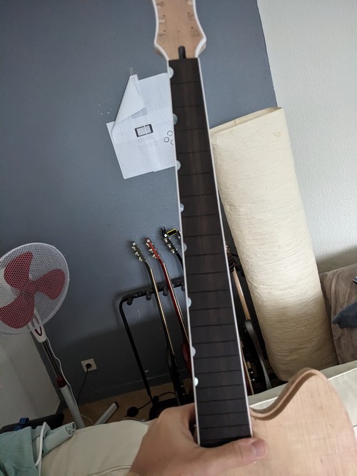 - Je reprends le manche de la précédente (dont la touche avait été décollée) pour lui mettre une touche typique gretsch en ébène / repères demi lune.